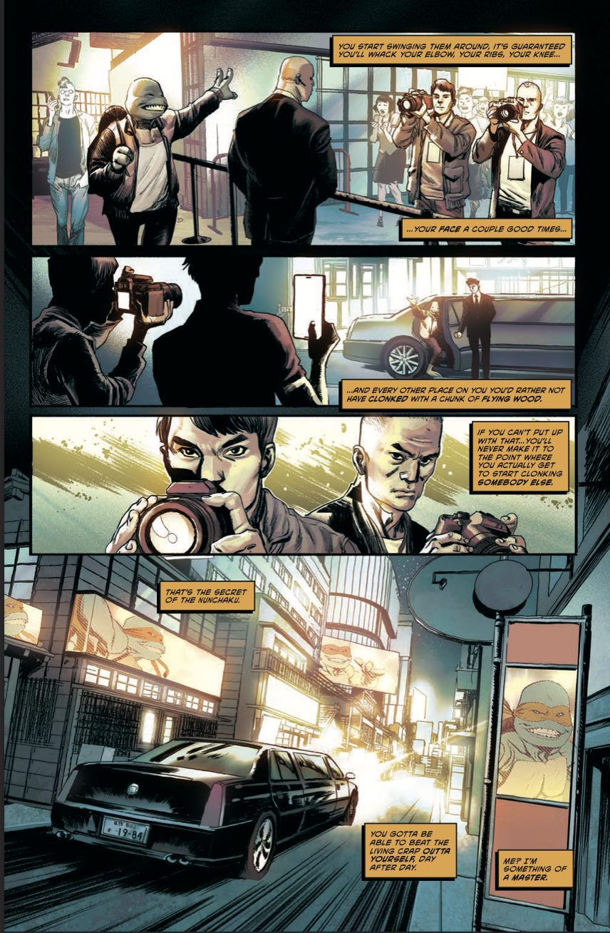 It’s not a spoiler (IDW revealed it in the issue’s solicitation) to say that Mikey’s new life includes him being a mega-successful TV star in Japan. On the surface it seems like the perfect fit for Mikey, the most outgoing member of the former Hamato clan. But what we actually see is that this couldn’t be further from the ideal life Mikey would choose if he had his way and it’s severely impacting his mental health. Aaron packs emotional punches throughout the issue with Mikey’s internal dialogue revealing just how down he’s really feeling.
