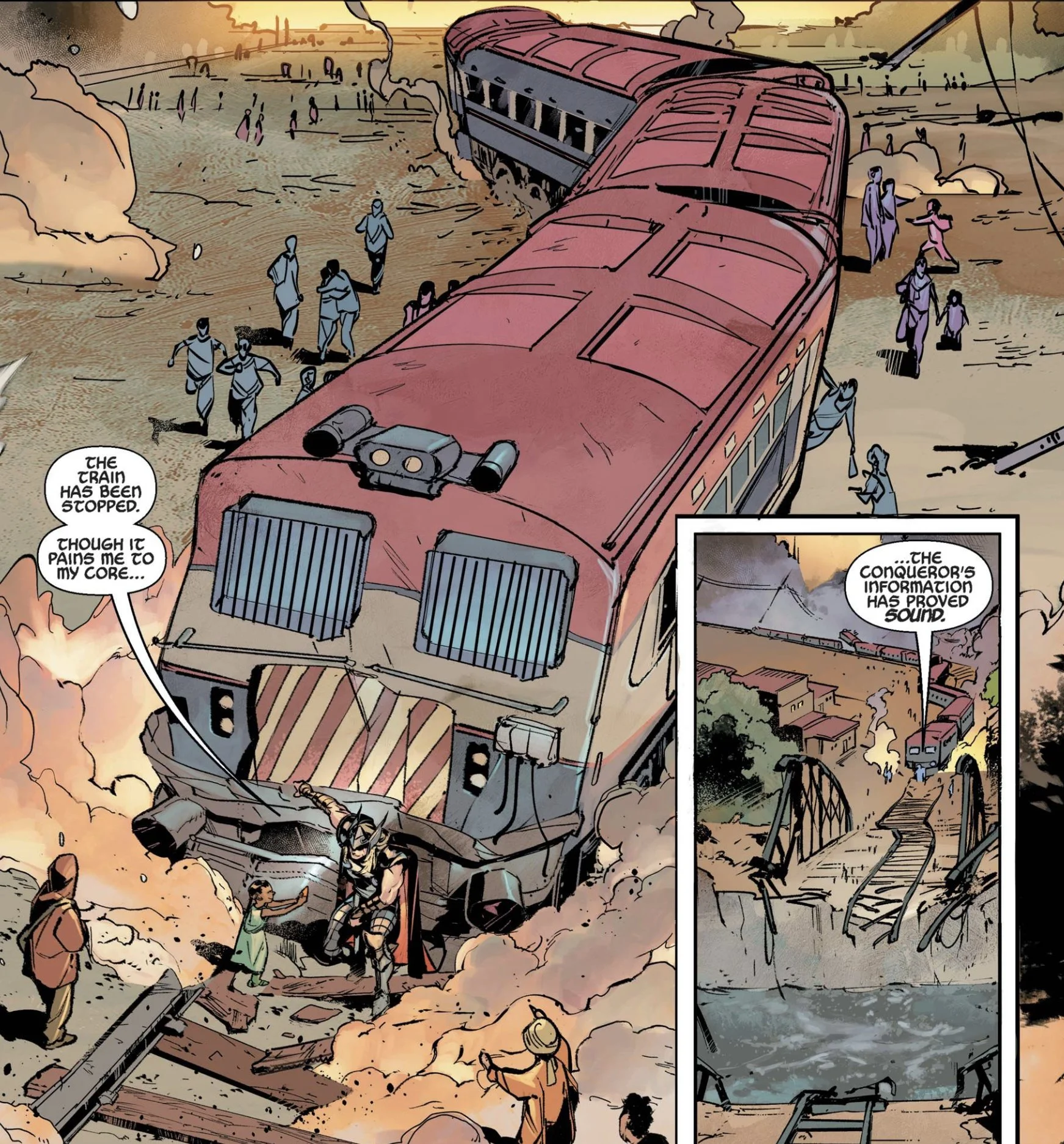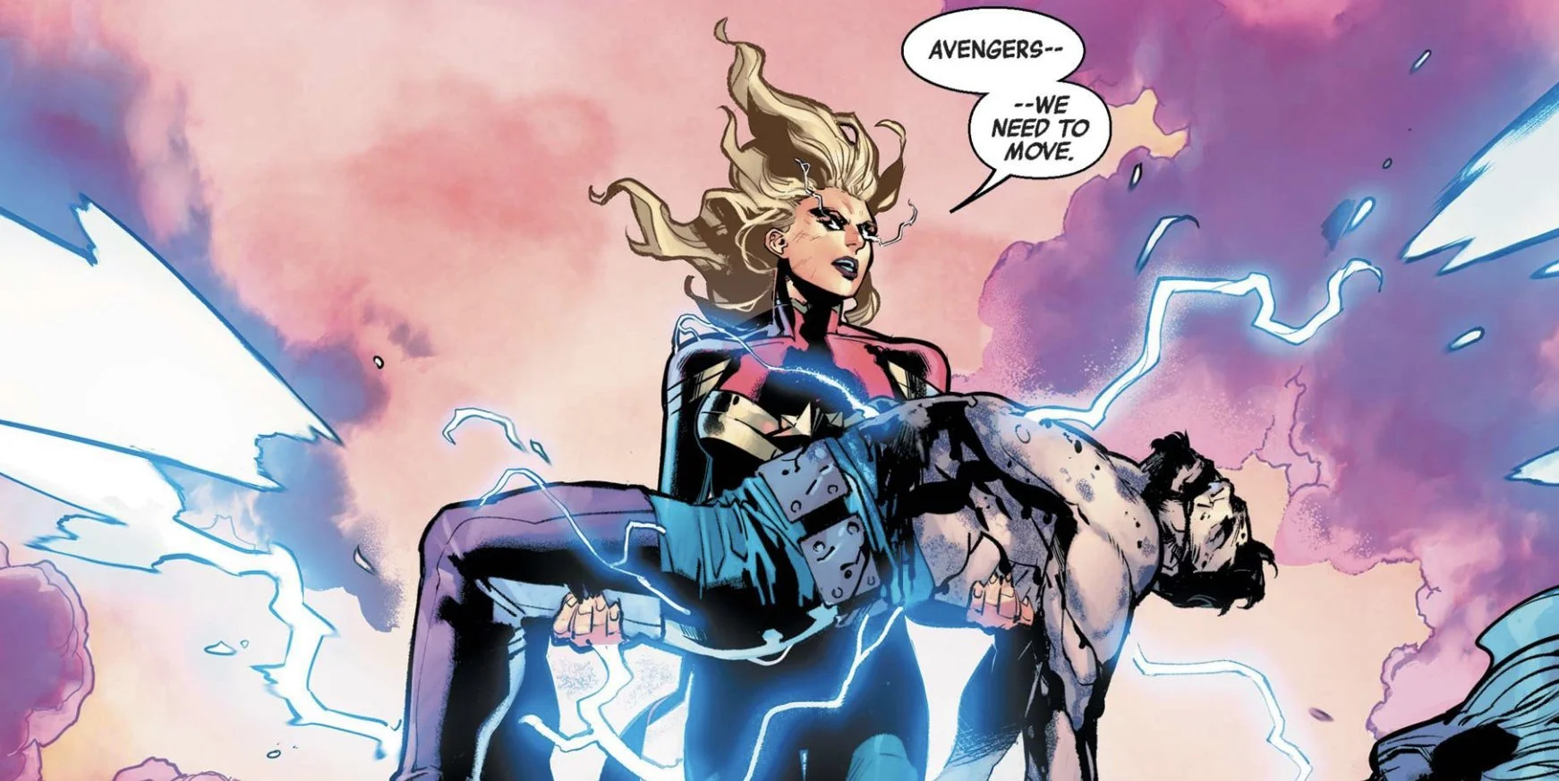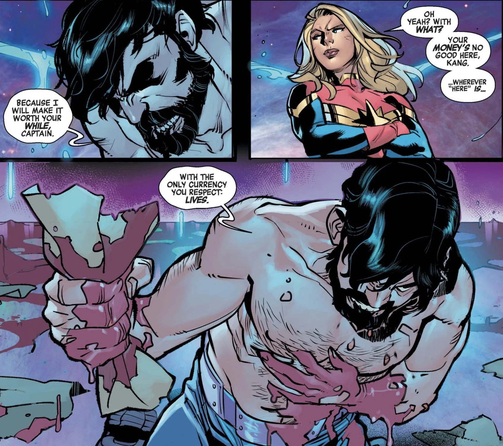 The issue picks up where the previous issue ended, with Captain Marvel returning from the null-time with a dying Kang in her arms. The rest of the issue takes readers in between two different timelines, one during the conversation in the null-time that we missed out on between Captain Marvel & Kang before she returned with his body and another during the present where we see individual Avengers stopping mass casualty events from happening. We learn the two timelines are related when Kang offers Captain Marvel a bribe — information on how to prevent 1,000 civilian deaths in 24 hours in exchange for the Avengers help in stopping the evil forces who left him in the state he’s in and have plans for far worse for far more people.