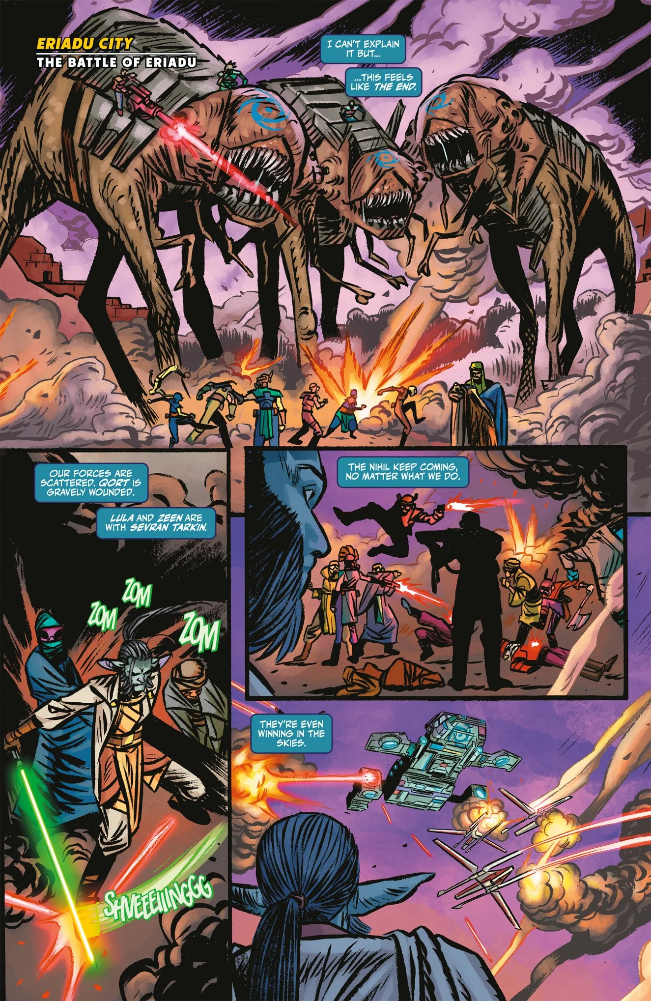 Eriadu is a battleground! Qort, Farzala, and their allies fight valiantly against the Nihil as they vie for control of the planet and the galaxy! But our heroes' brave yet meager fighting force is drastically outnumbered by Marchion Ro's vast army, bolstered by merciless droids and savage war beasts. Will help arrive for the forces of light and life before they are overwhelmed?