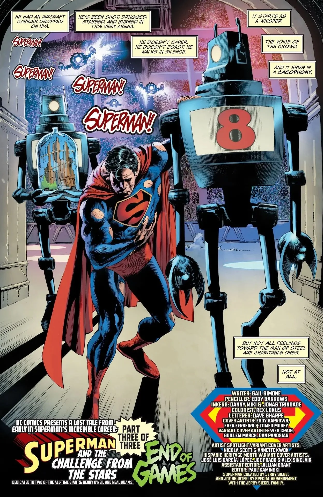 IT'S INTERGALACTIC WAR AS THE SUPERMAN SUPERSTARS ERA CONTINUES! THE CHALLENGES CONTINUE as Superman finds himself an UNWILLING GLADIATOR in a war of a thousand worlds! Either he completes the challenges, or we lose the cities of Paris, Chicago, and KANDOR! Join us on a wild tale of adventure and inter-galactic WAR! Plus, is there a way for Lois and Clark to keep working together without compromising their values--and their relationship?