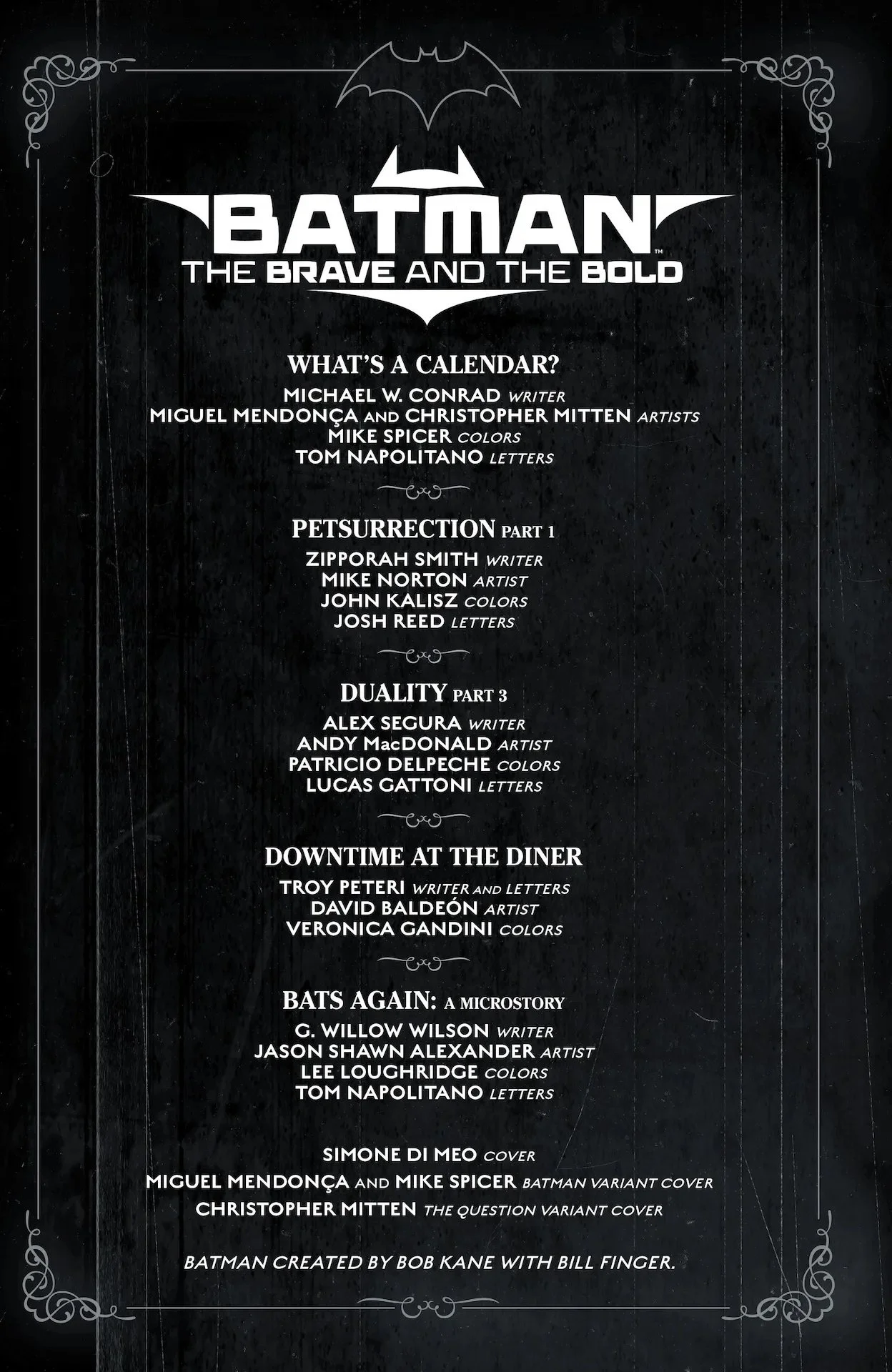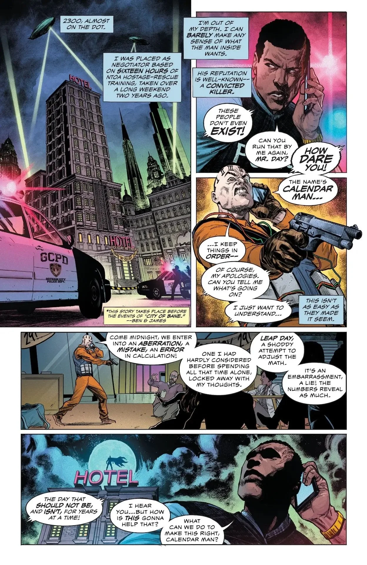 Written by Michael Conrad, Torunn Gronbekk and Alex Segura Art by Miguel Mendonca, Christopher Mitten, Fernando Pasarin and Andy MacDonald Leap year only comes once every four years, and for most, an extra day on the calendar is a mild novelty. But for Calendar Man, it's a critical error in that which he holds most dear--and now, Batman and the GCPD respond to a deadly hostage situation, but can they work together to stop Calendar Man before it's too late? Then, Lois Lane dives deeper into a massive conspiracy--but will it swallow her up in the process? And lastly, the Question--with the help of a surprise guest star--unmasks the mysterious villain Zero!