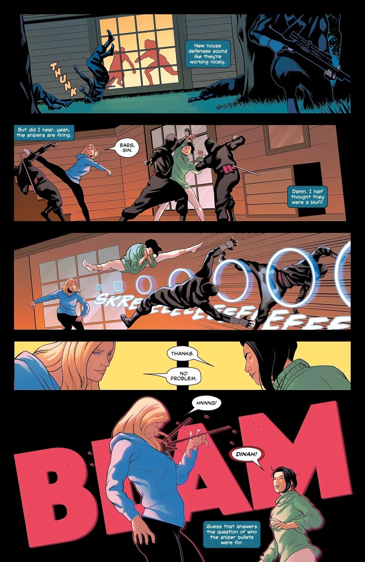 THE LEAGUE OF ASSASSINS PRESSES THE ATTACK! Black Canary, Sin, and Megaera try to bond through violence as they find themselves overwhelmed by a splinter League of Assassins clan bent on reacquiring Sin. Maybe leaving Barda at home wasn't the best idea? Elsewhere, Barda, Cass, and Constantine face the unexpected as they try to return a mischievous demon home while trapped inside the mysterious area known only as the Seam.