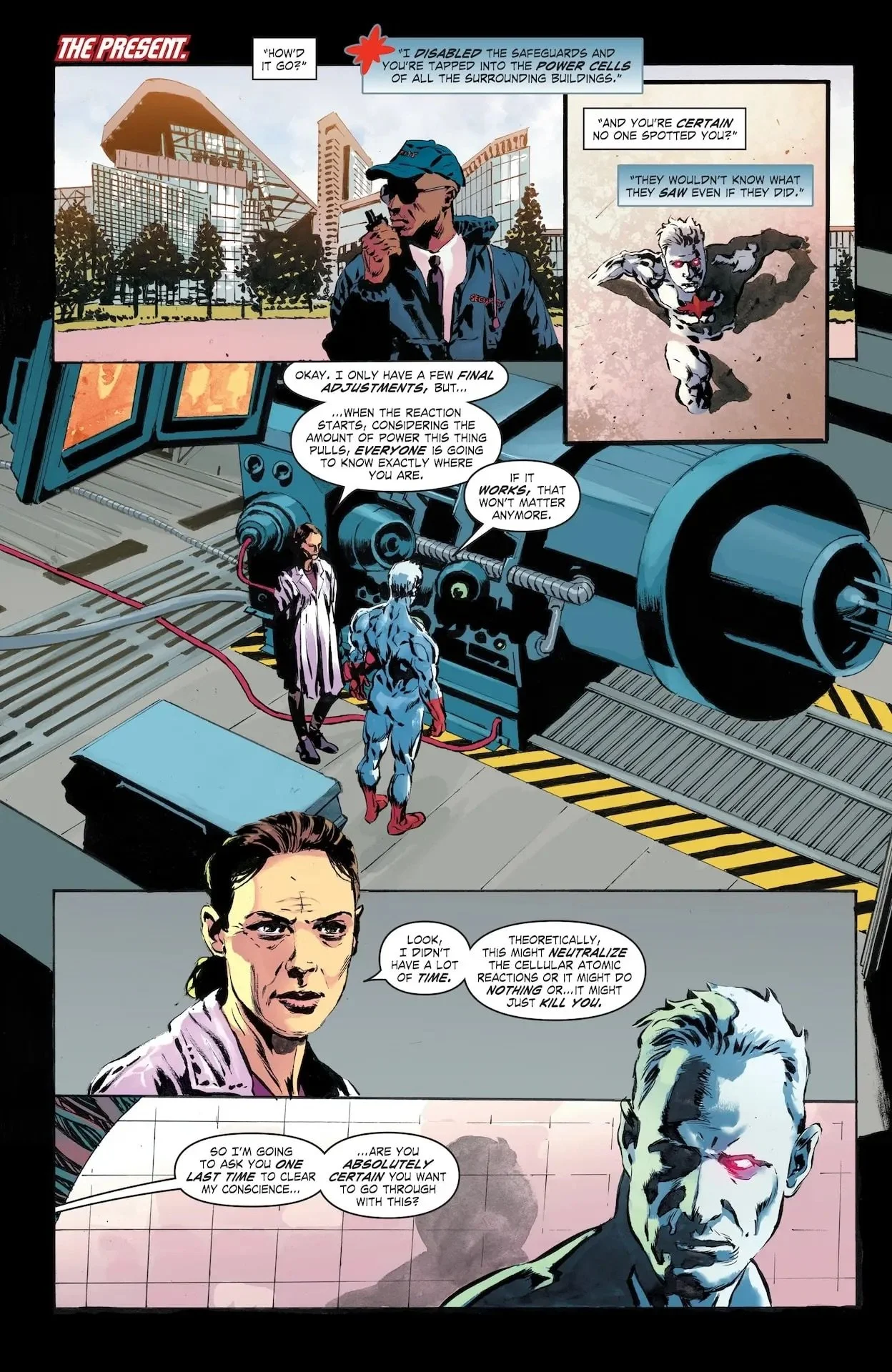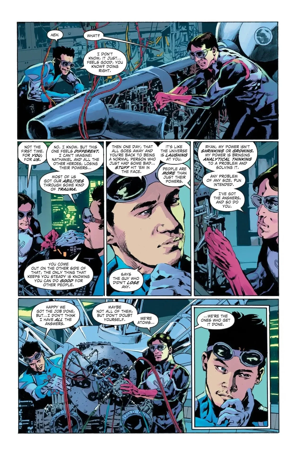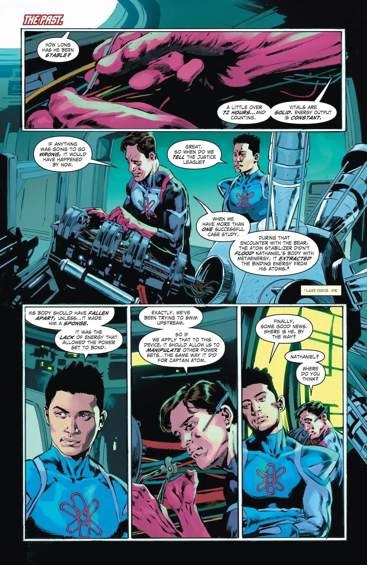 WILL THE ATOM PROJECT TEAR ITSELF APART? On the run and out of allies, Captain Atom is forced to take a desperate step into his own past in search of assistance. At the same time, Ray and Ryan's latest experiment puts them at odds and could lead to disastrous consequences for all those on board the Watchtower. As the metahuman arms race with the terrorist group known as INFERNO escalates, dissent in the ranks of the Justice League's Atom Project must be quelled before catastrophe overtakes the planet!