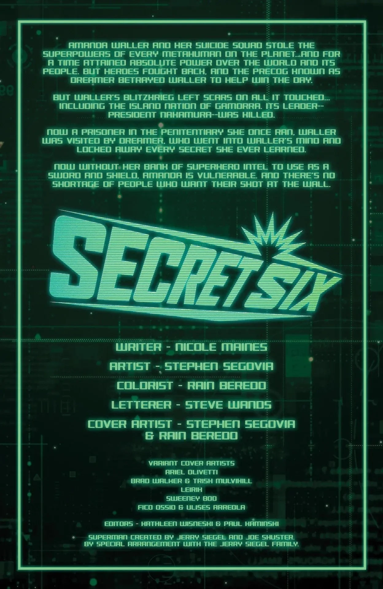 WHO WILL CONTROL THE SECRETS OF THE DC UNIVERSE? In the wake of Absolute Power, the Justice League has returned, the war criminal Amanda Waller is in prison, and things are finally getting back to normal...that is, until Dreamer, Jon Kent, and Jay Nakamura discover that Waller has somehow vanished into thin air from her cell! With seemingly no leads and nothing but questions (and enough trauma to fill a swimming pool), our three heroes are forced to team up with the bad guys--Deadshot, Catman, and Black Alice--to track down Waller, reclaim the infinite trove of secrets in her head, and uncover what the deal is with all these freakin' chess pieces they keep seeing around...all without letting their own individual secrets tear them apart from the inside. From acclaimed writer and actress Nicole Maines (Supergirl) and superstar artist Stephen Segovia (Spawn), the Secret Six are back in an all-new high-stakes, twist-filled limited series!