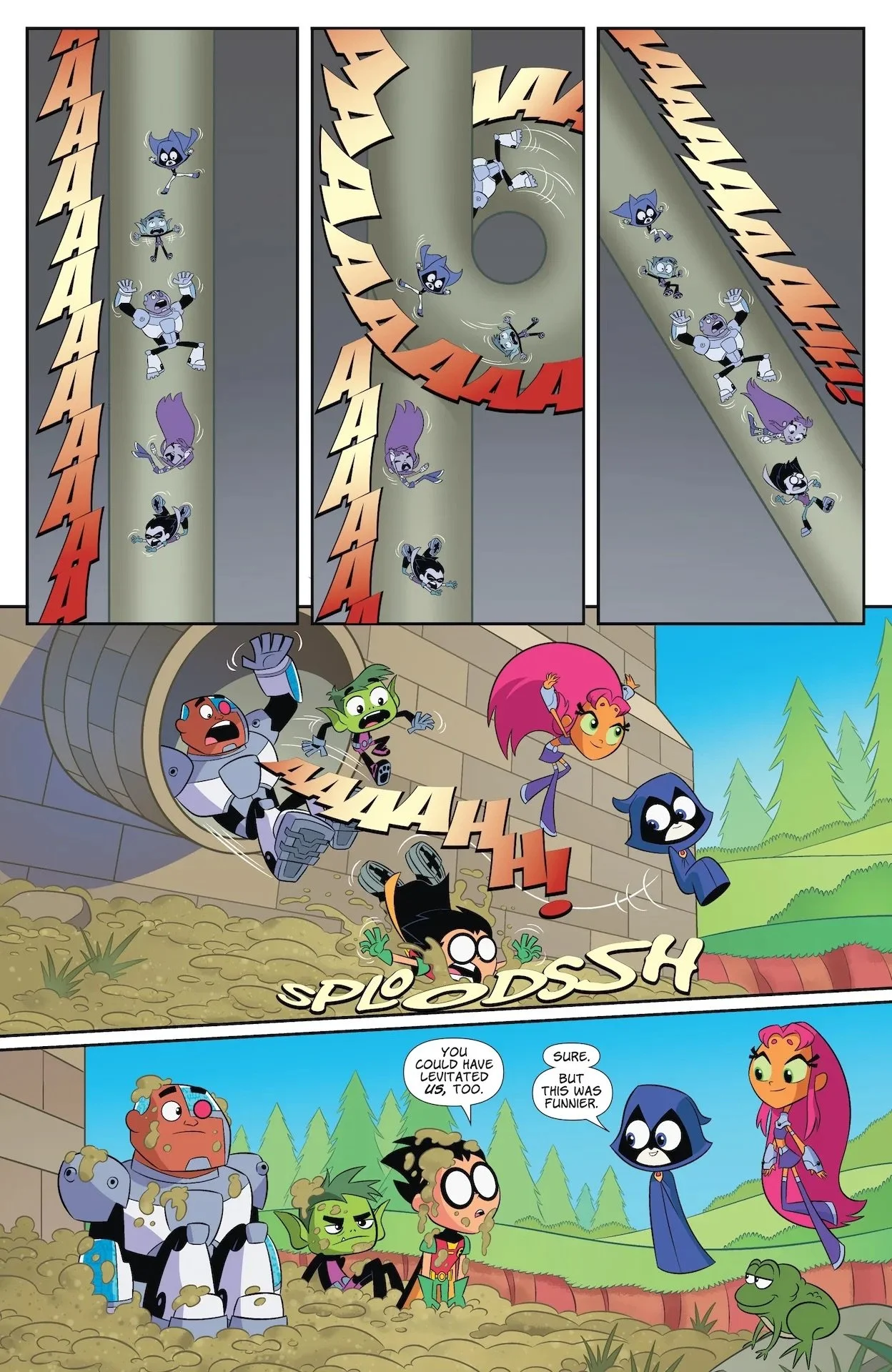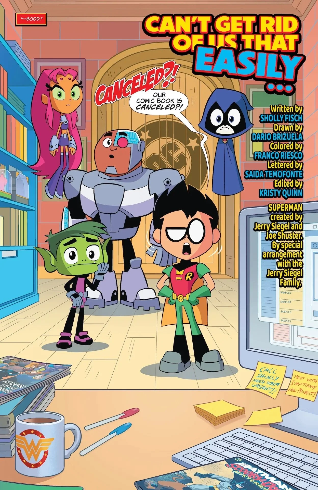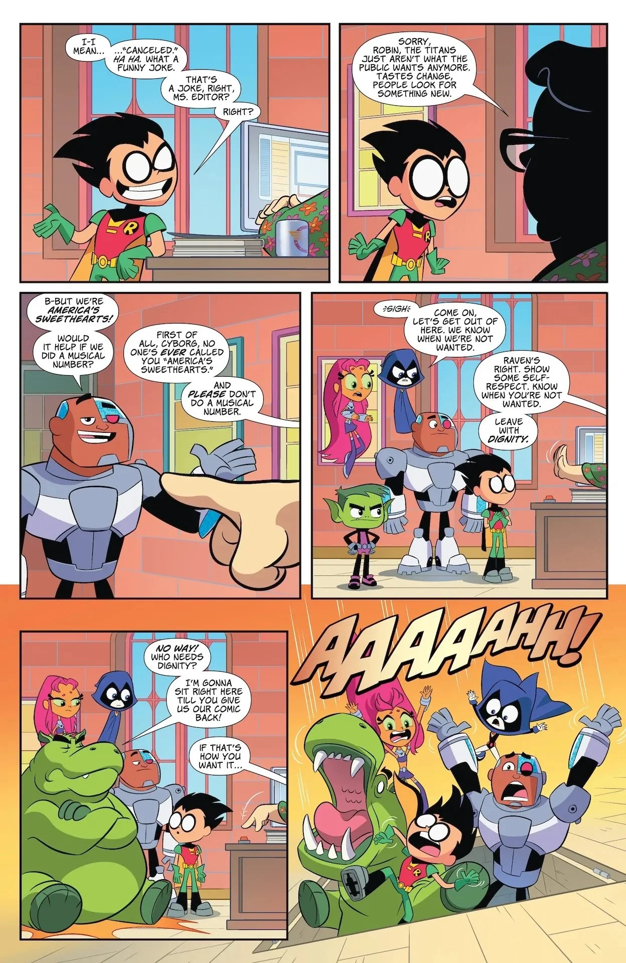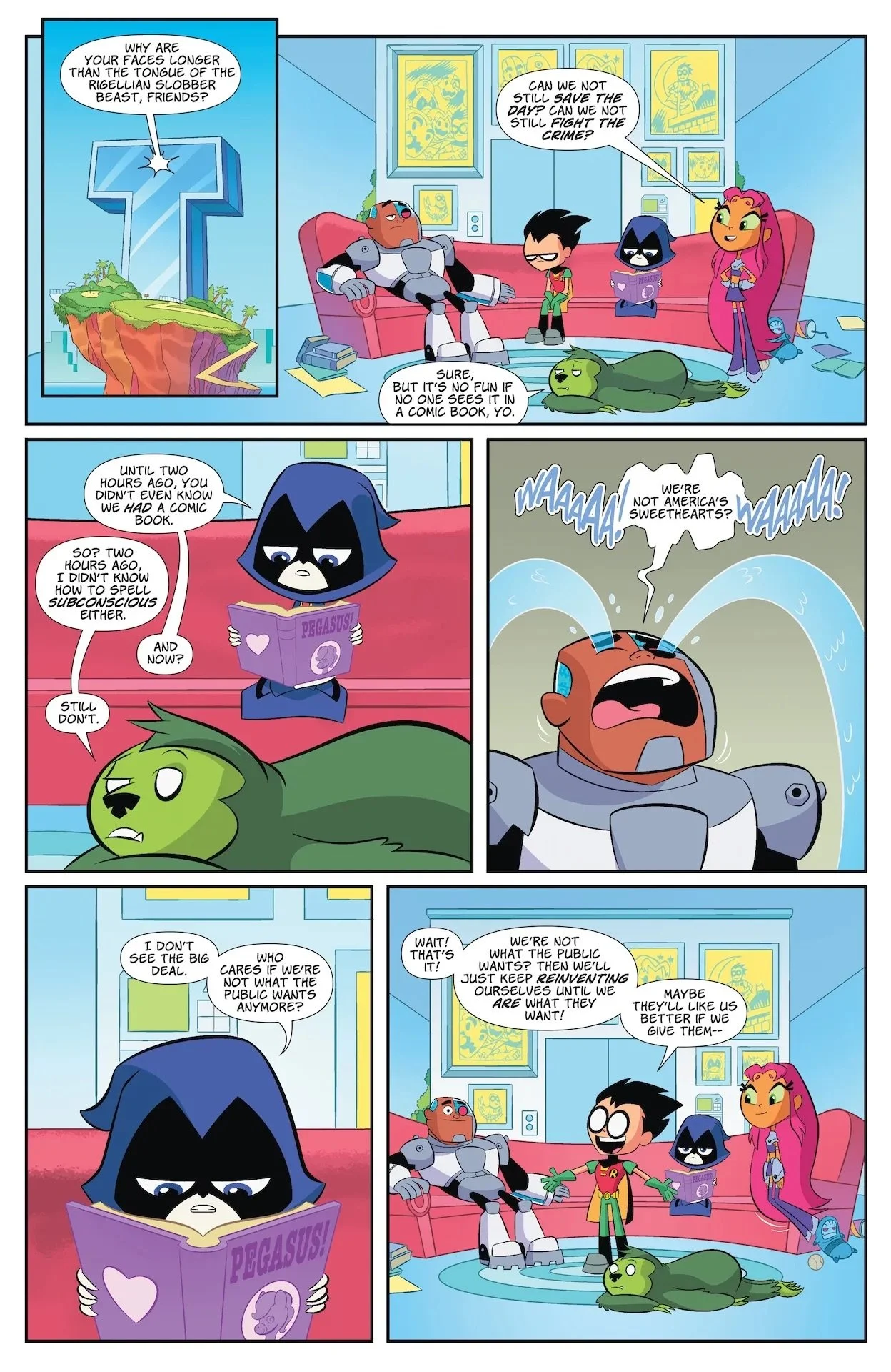 THE TEEN TITANS GET ARTISTIC! Say it ain't so! The Titans' comic book--canceled?! Desperate for a relaunch, the Titans remake themselves as everything from transforming robots to artsy, black-and-white indie comics characters. But when DC still doesn't bite, the Titans turn to more drastic measures...like sabotage.