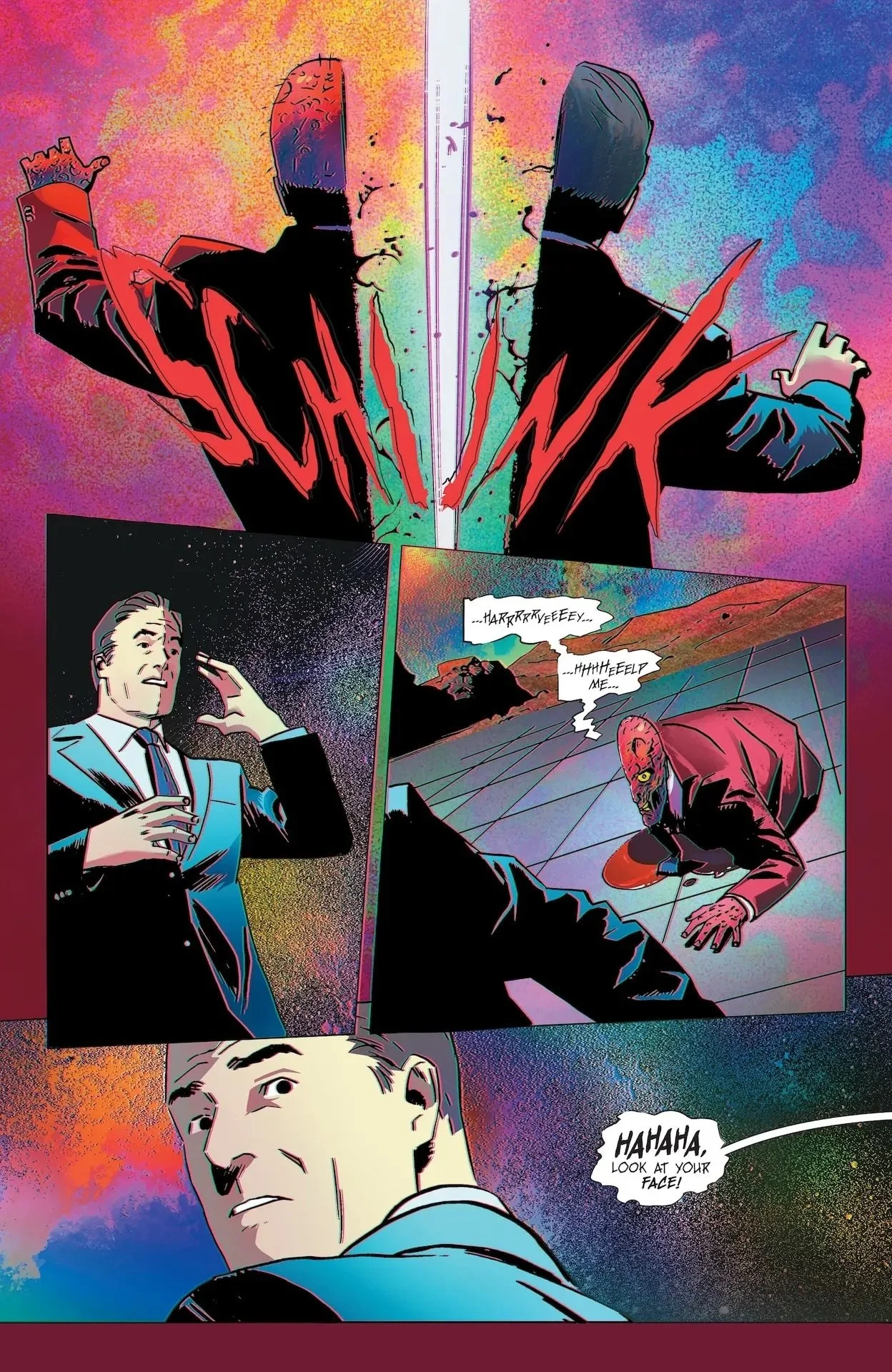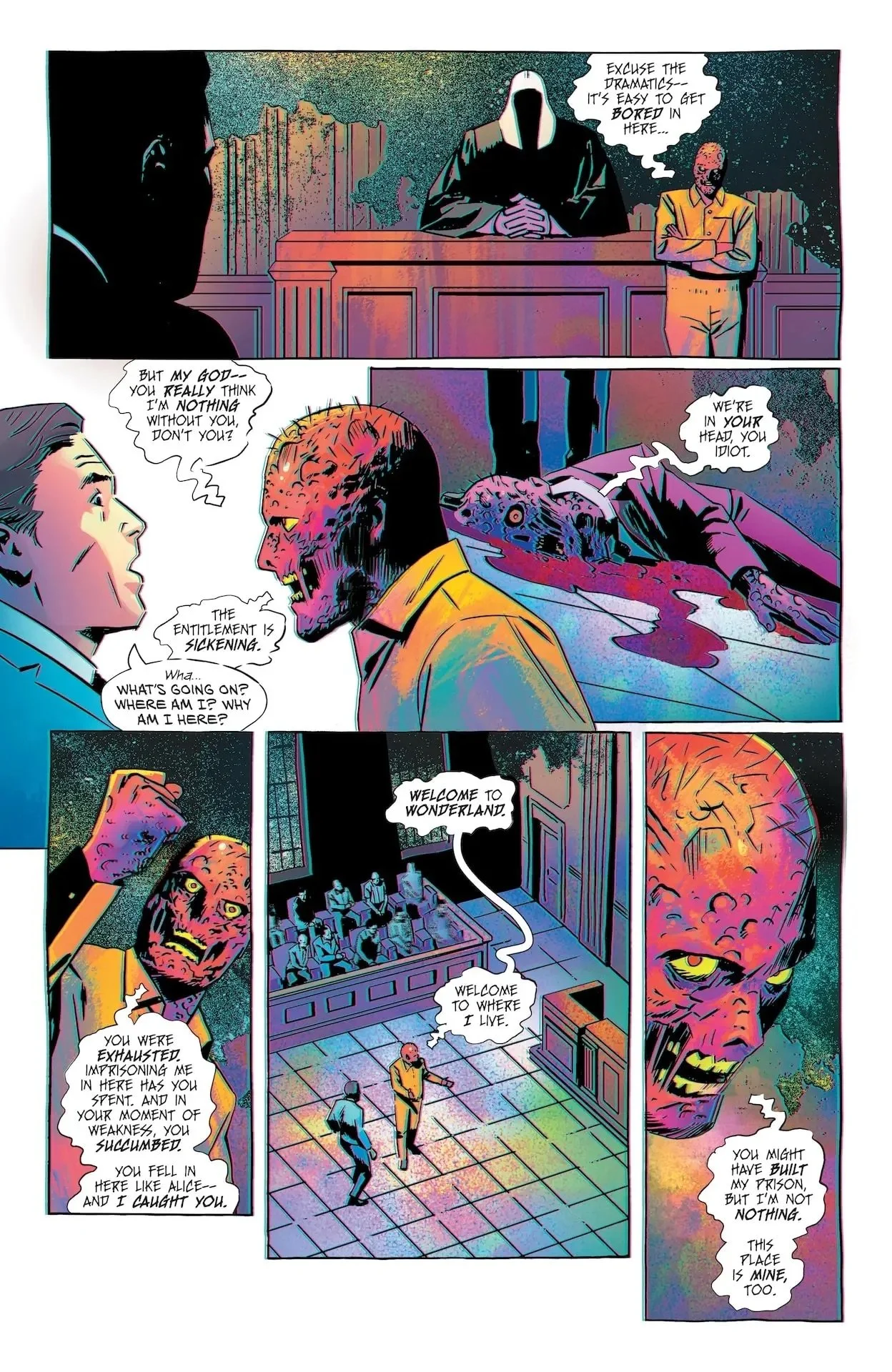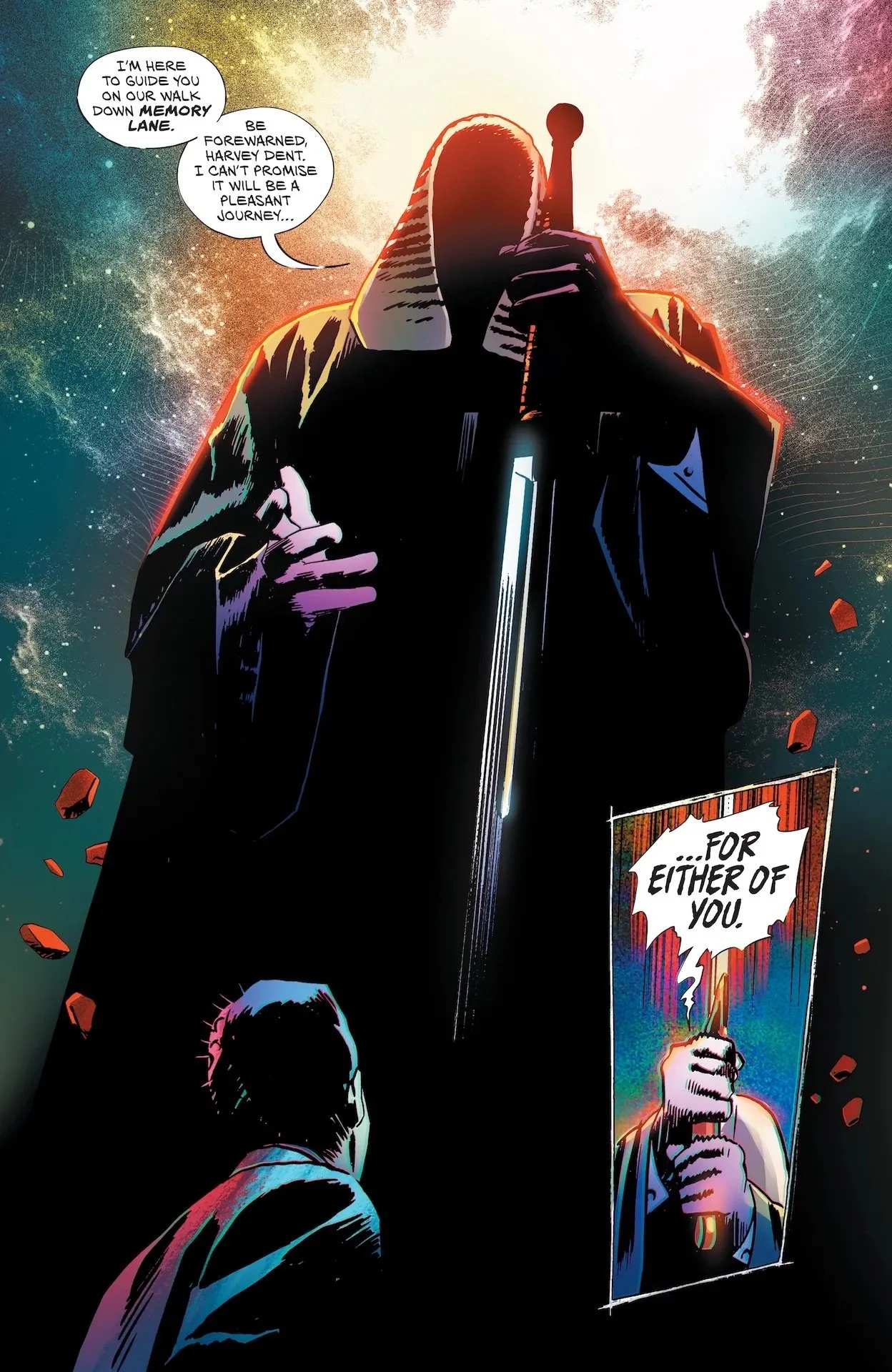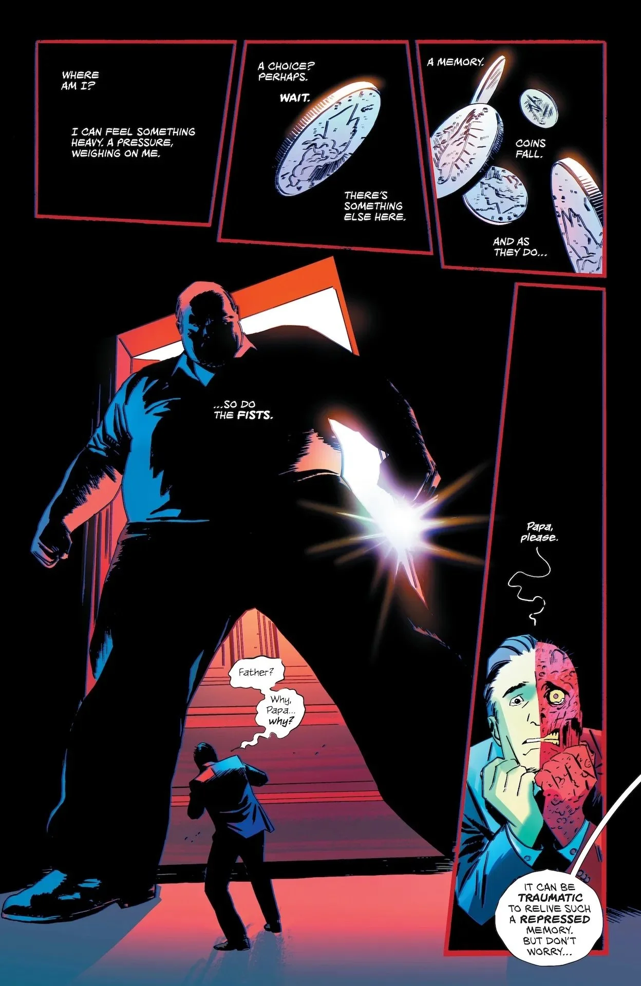 THE TRIAL OF HARVEY DENT! Pushed to the brink, Harvey Dent's mask of sanity is slipping, leading him to the deepest recesses of his own twisted mind, as memories collide with haunting traumas from his past. This is the trial of Harvey's life, and Two-Face must face the ultimate judgment. Will he let go and rise above his shattered past, or will his darker half take over his body once and for all?