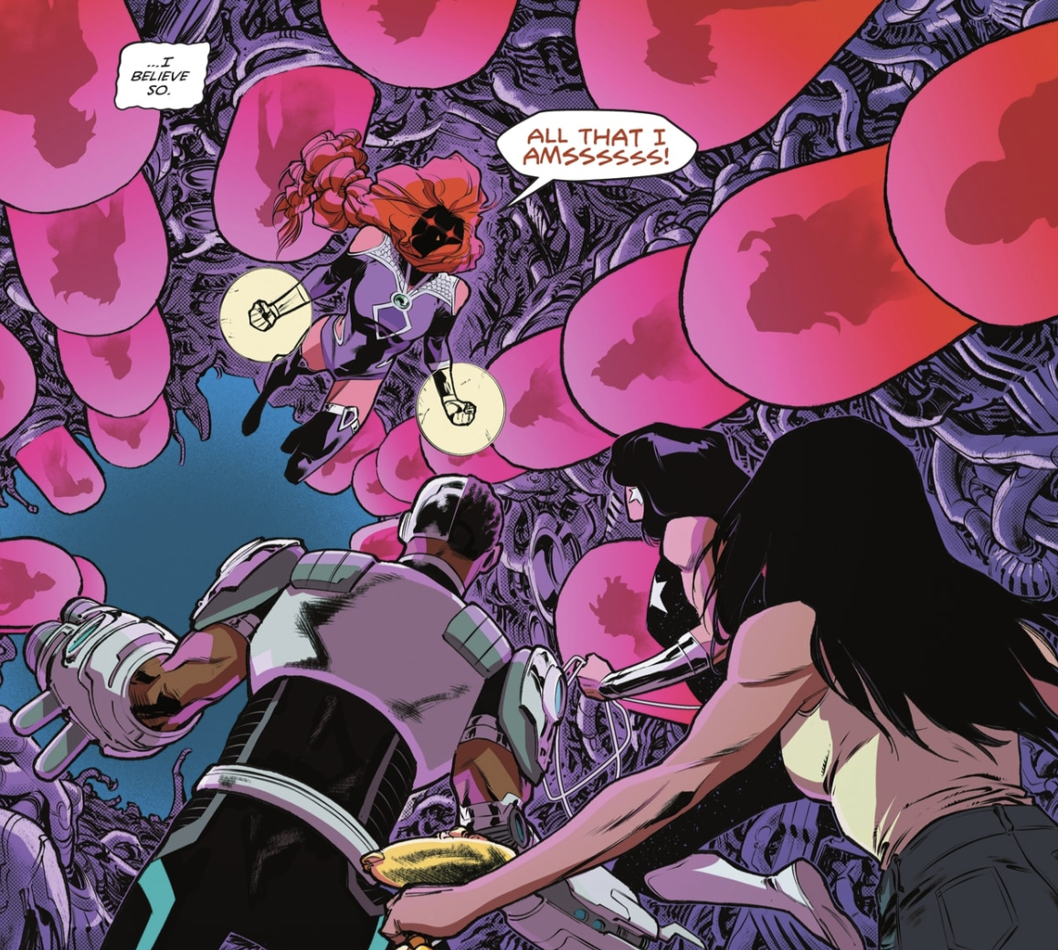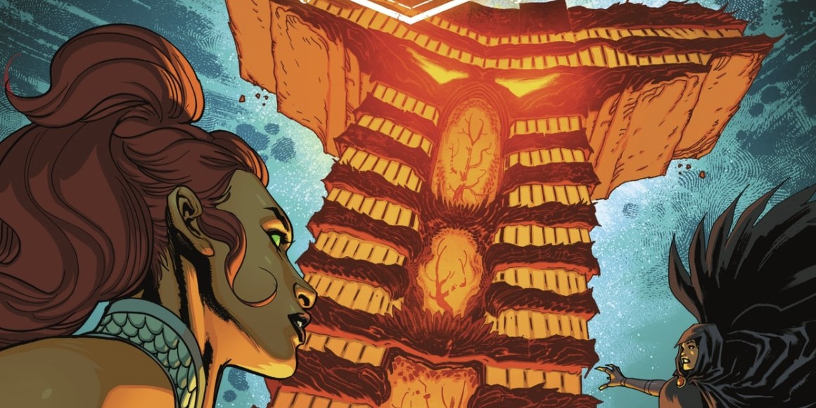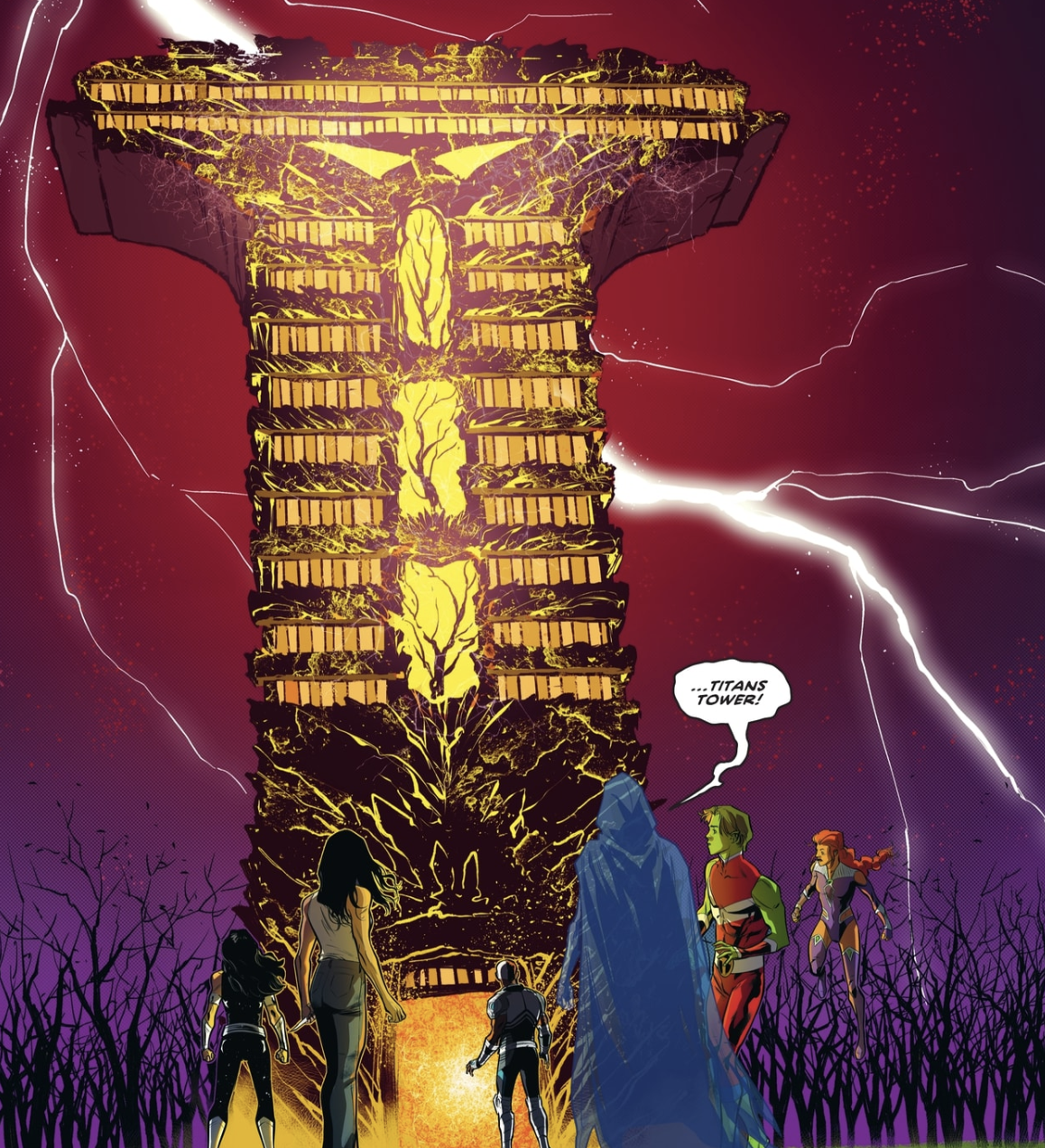 The story follows an unnamed female character (who is weirdly never named) trying to escape a haunted building where terror seems to be behind every door. Along the way she encounters different member of the Titans who are trapped in their own mini nightmares, but we never spend quite enough time with any of them to get invested. Donna Troy and Starfire’s nightmares are especially sped through to assemble the team ahead of the final arc of the book. Luckily our female lead has been mentally connected to Raven the entire time, who guides the whole group to the building’s exit. Raven’s presence is waiting for them outside, where they learn they were trapped inside Titans Tower the whole time. Yes, a tower was having a nightmare.