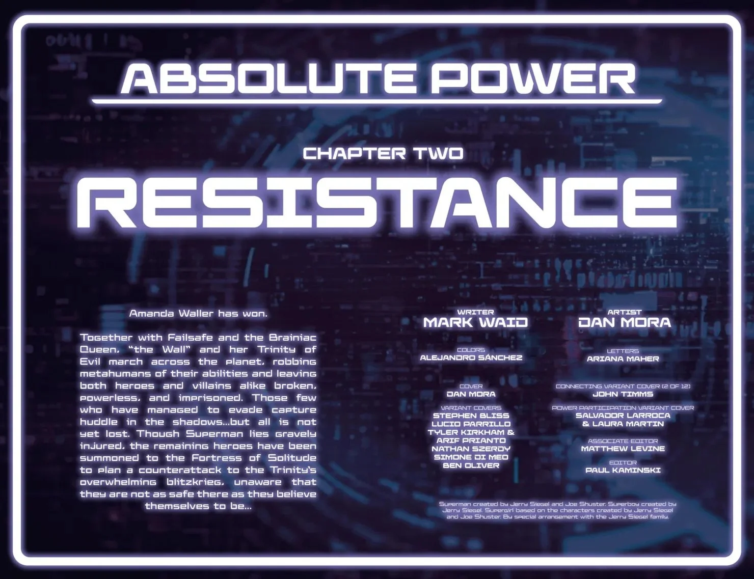 SIEGE OF THE FORTRESS OF SOLITUDE! In the aftermath of Amanda Waller's total victory, the metahumans of the DC universe have been depowered, scattered to the wind, and are reeling from critical defeat across the planet. But the resistance lives on. Any heroes not rounded up by the TRINITY OF EVIL have rendezvoused at Superman's Fortress of Solitude...but even this sanctuary of peace and hope is not safe from Waller's blitzkrieg. The precog known as Dreamer has pointed Waller's weapons to the frozen tundra where our heroes lick their wounds...and the shocker general leading Waller's charge to raze the fortress to the ground will leave you breathless. It's underdog versus complete global domination in this epic second installment of the ABSOLUTE POWER saga!