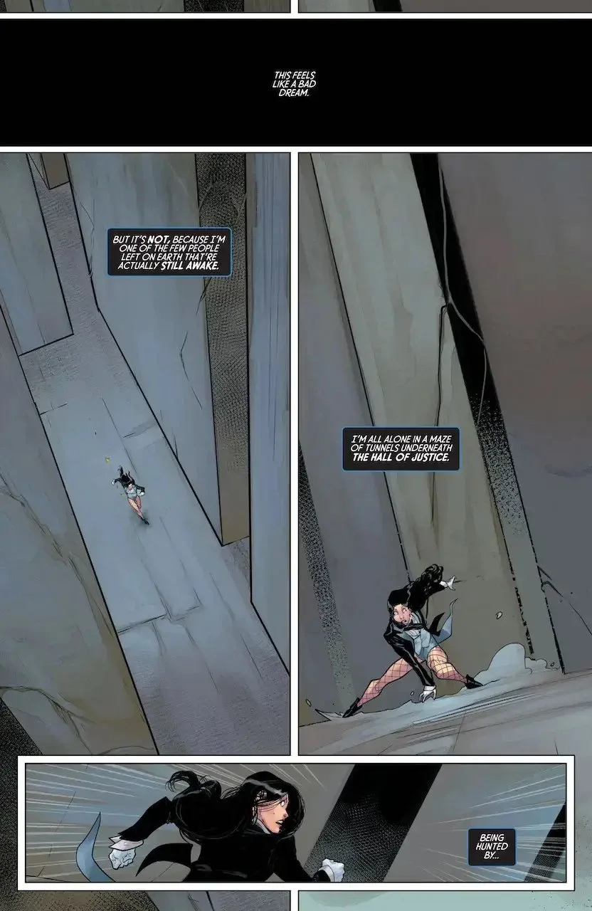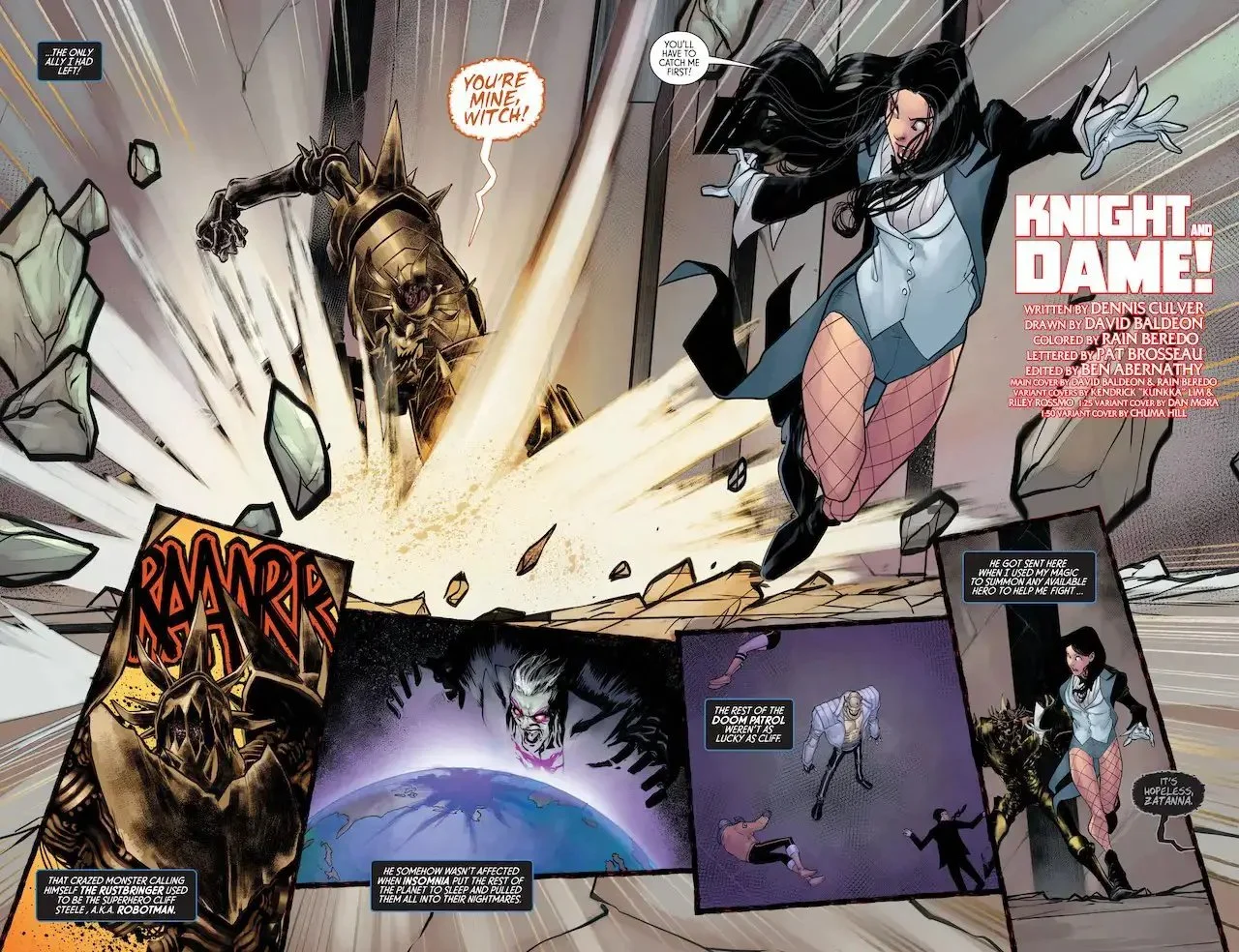 Insomnia's Sleepless Queen has transformed Robotman into one of her knights, and now the hunt is on for Zatanna to join them! If the Sleepless Knights succeed in making her one of their own, the Earth will never wake from its unending nightmare. Powerful magic comes with a powerful price, so Zatanna must decide whether she's willing to pay it to save the world. Which means things aren't looking good for Robotman!
