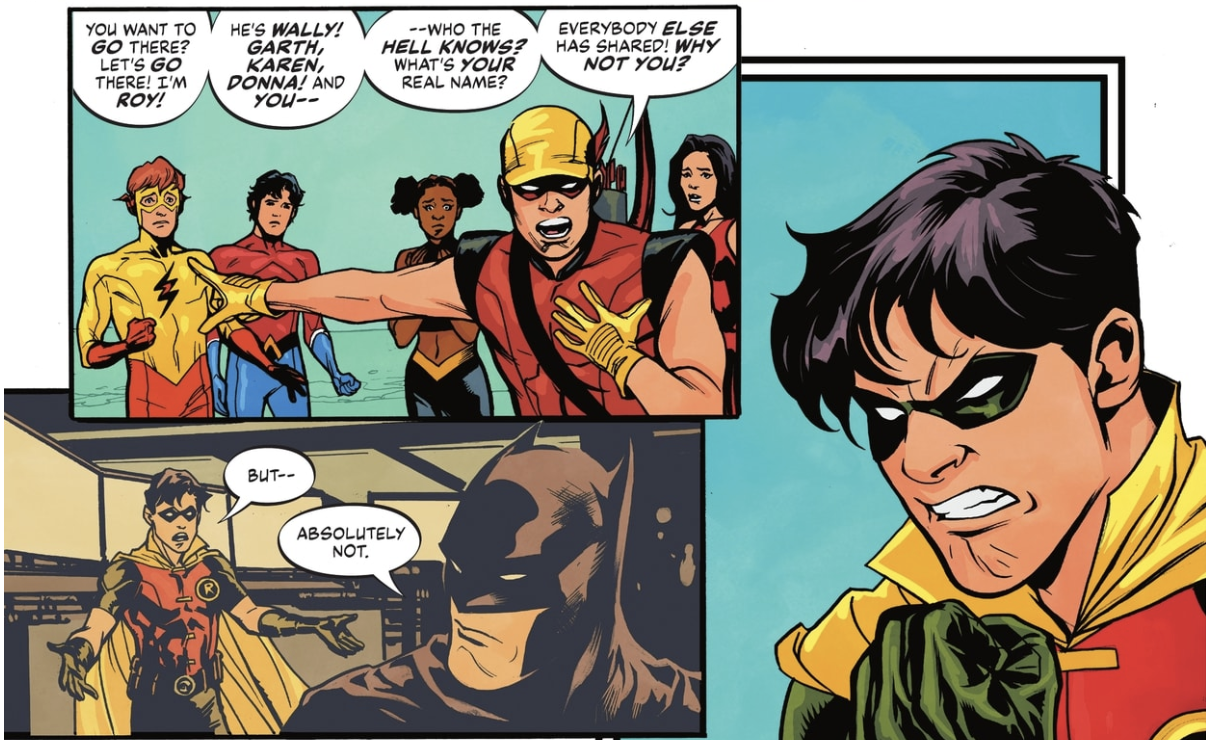 Robin’s internal and interpersonal conflicts are specifically highlighted throughout the book after he gets into an argument with Roy Harper/Speedy. He’s faced with trying to lead a team with very different personalities and perspectives, while also dealing with becoming his own superhero and stepping out of Batman’s looming shadow. Waid does a phenomenal job creating a palpable sense of weight on Robin’s shoulders that I’m excited to see developed further in subsequent issues. While Robin’s story does take center stage, Waid makes sure to give each Titan time to shine and we get to see each character’s unique personality at some point throughout the book.