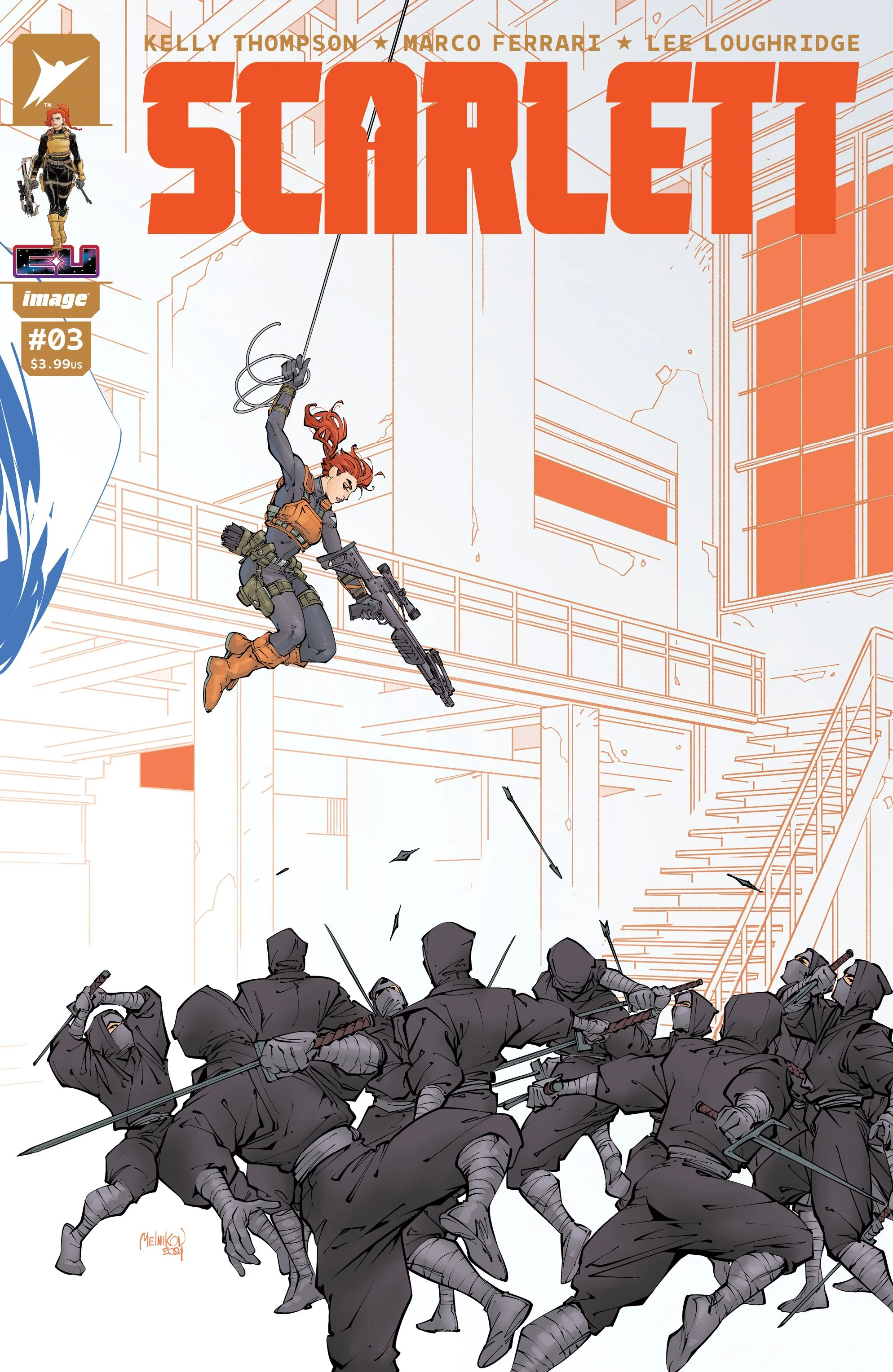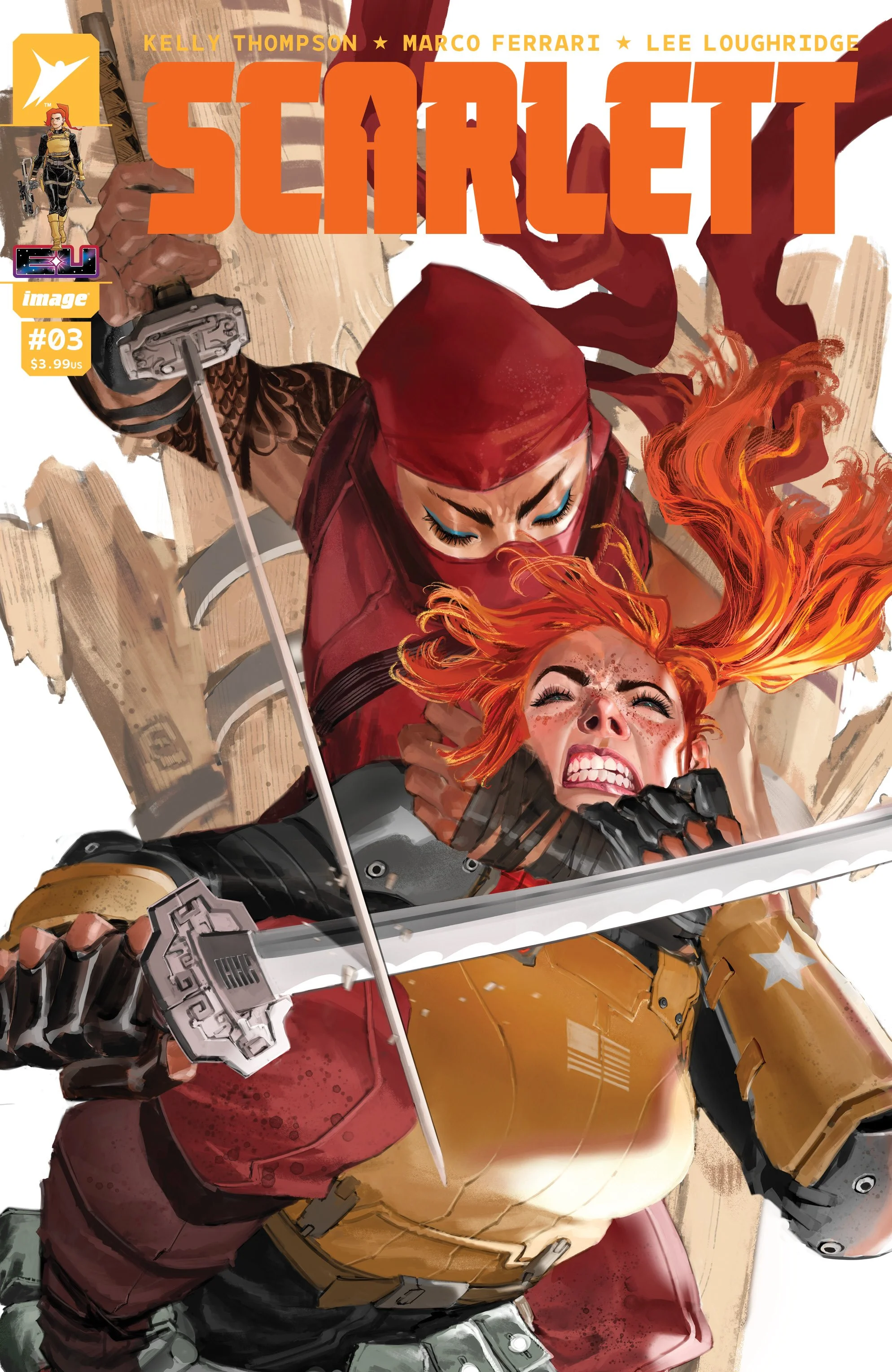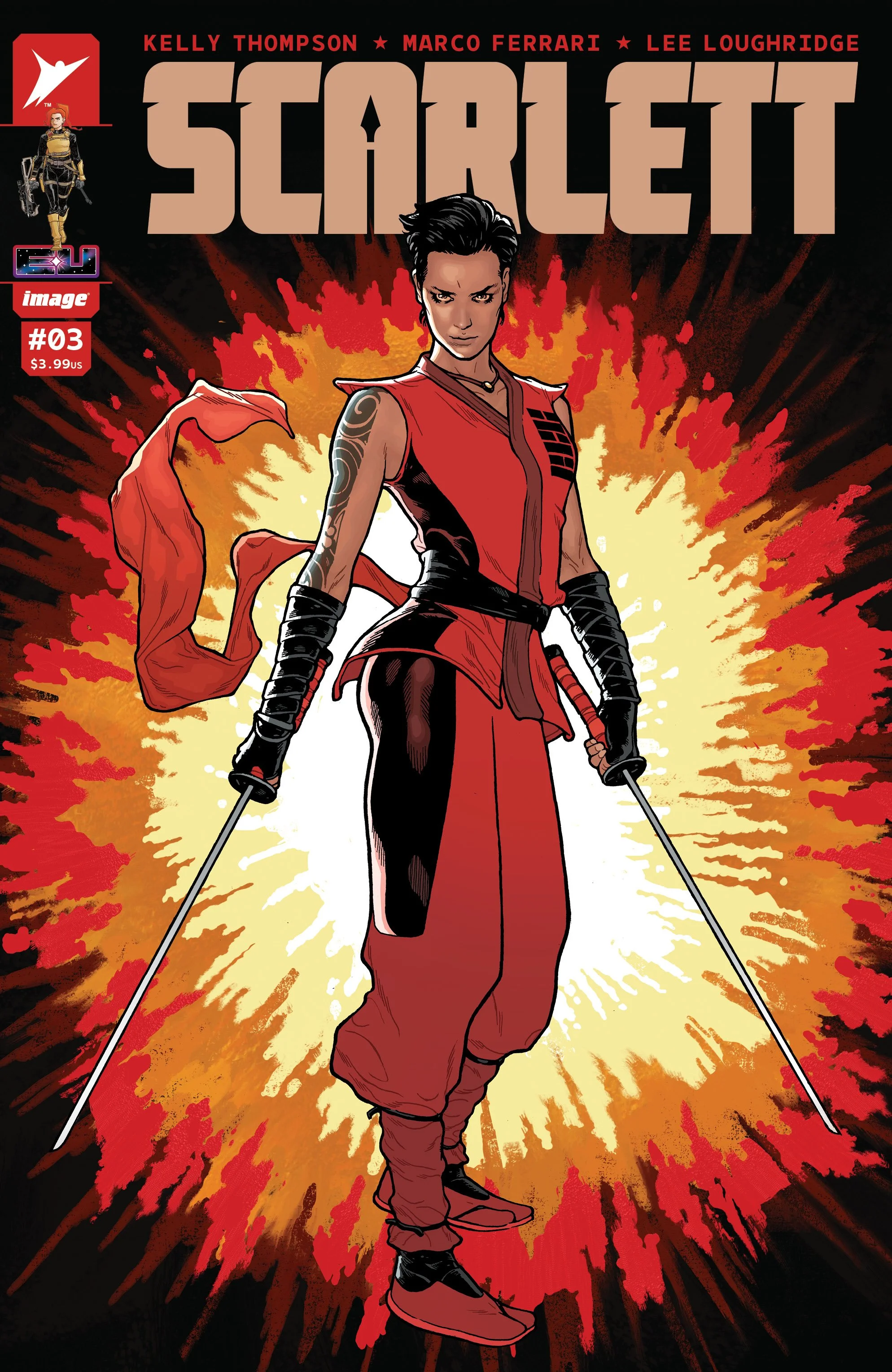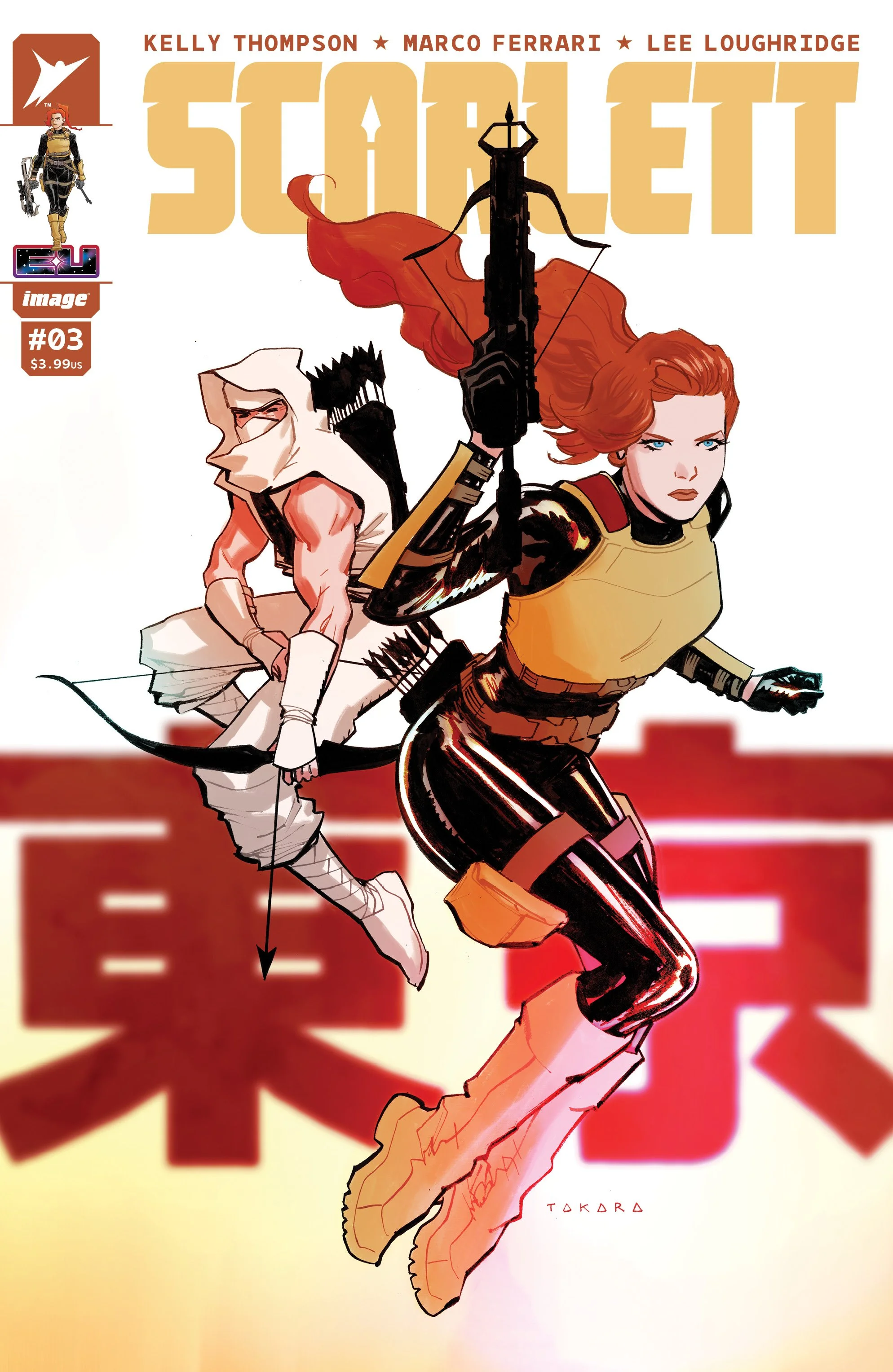 Scarlett #3 features a main cover by Marco Ferrari, along with variant covers by Marcio Takara (Captain Marvel), Gleb Melnikov (Robin), Jeff Spokes (Batman: The Brave and The Bold), and Eric Canete (Iron Man: Enter the Mandarin).
