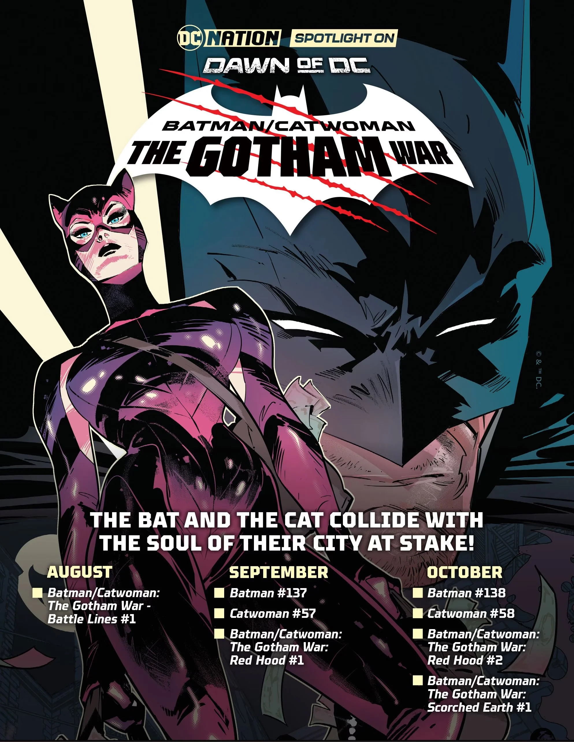 After sharing a first look at GOTHAM WAR BATTLE LINES #1 earlier this week, DC Comics is back with even more reveals related to the upcoming Batman/Catwoman crossover event that will rock Gotham. Keep scrolling for brand new connecting cover from Joe Quesada, an event reading guide, and a synopsis and preview of interior panels from a few of the issues provided by DC!