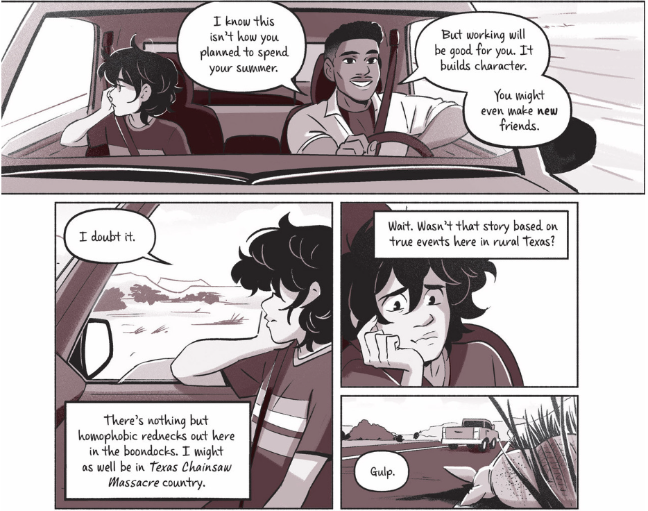The storytelling in Northranger is both engaging and suspenseful, capturing the reader's attention from start to finish. The graphic novel excels in creating an atmosphere that heightens the sense of mystery and tension. The artwork beautifully complements the narrative, with its attention to detail (black gutters are swapped in during night scenes) and expressive character designs. The complex relationships and dynamics between Cade and the Tyler twins further enrich the story, offering layers of depth and emotional resonance. During some of the more serious conversations, it’s easy to forget that the characters are only teenagers. Terciero does an outstanding job bringing depth to the characters and making each point of tension grip at your heartstrings.