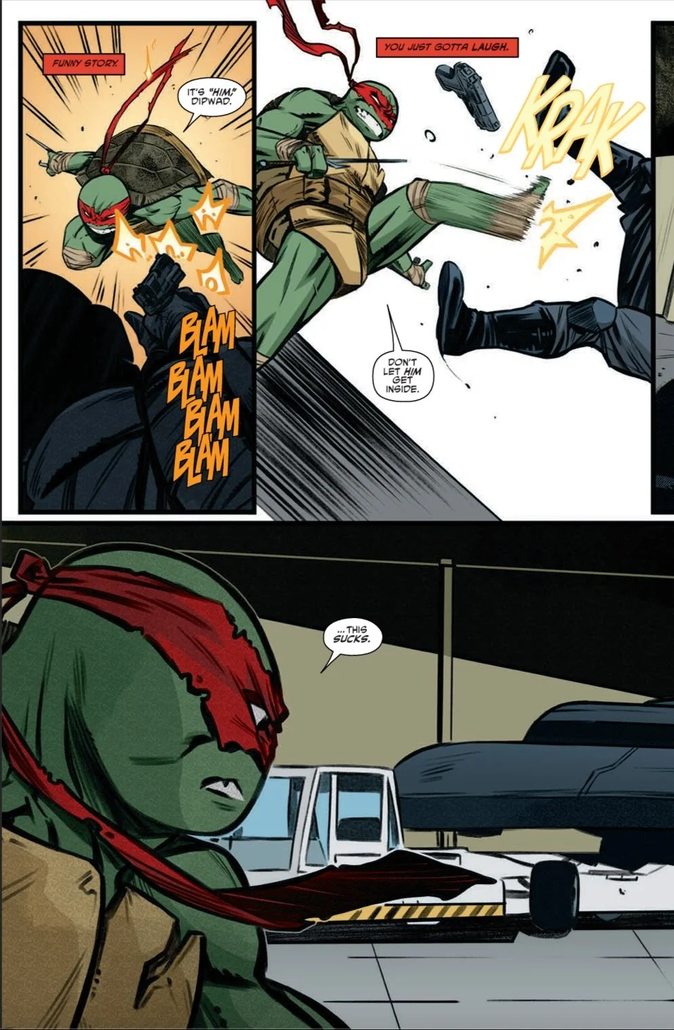 Assist an old enemy in breaking into a highly restricted, heavily guarded, famously classified government facility? It's not exactly the freewheeling road trip Raphael had in mind, but with Pepperoni's life in the balance, he's diving in headfirst. It's the point of no return as Raph and Metalhead breach Area 51! Surrounded by the E.P.F.'s coveted technology, Metalhead's motives come to light. He'll stop at nothing to commandeer the secrets of this dimension! Time is running out for Raph to find Pepperoni and use his strength for good... but a clean plan is off the table when old friends call out for help.