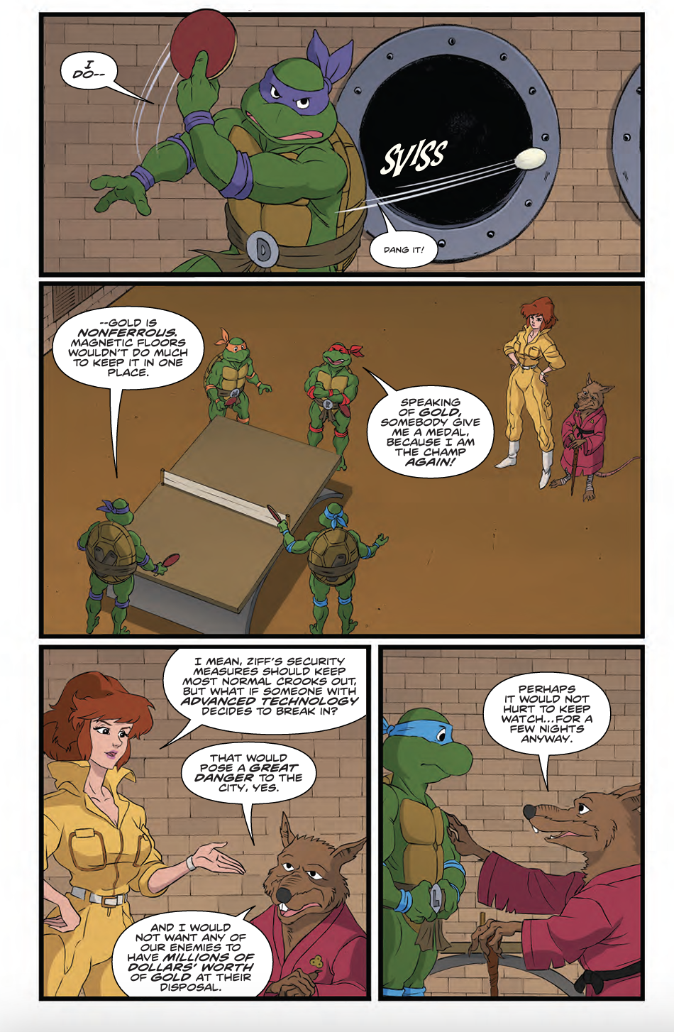Security expert and entrepreneur Ken Ziff, who believes his security system is the most advanced in the world, publicly dares the criminals of the city to try to steal from his repository of gold bullion! This draws the attention of not just intergalactic criminal mastermind Old Hob, who is stuck on Earth and eager to build a new empire, but Krang, who wants the precious metal for his own purposes. Naturally, the Teenage Mutant Ninja Turtles stand in the way of such a robbery, but something else lurks in Ziff's vault that could spell the Turtles' doom! Saturday Morning Adventures continues with... "Bullion for You."