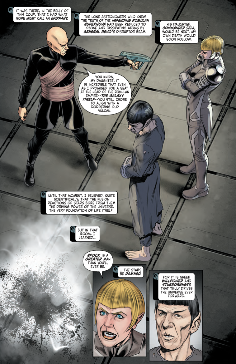 Spock and Sela are trapped in the belly of the Romulan warbird Taredrix and General Revo's coup. The three of them are the only living souls who know of the impending Romulan supernova. With Revo offering Sela the choice between death or a seat at the head of the empire itself, Spock will learn the answer to the question of what drives the universe ever forward: sheer willpower or blood? Meanwhile, it's up to Worf, B'Elanna, and Ro to save the pastoral planet Antara from the hostile Romulans seeking to take it as their own.