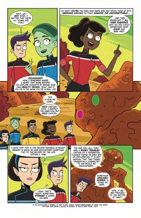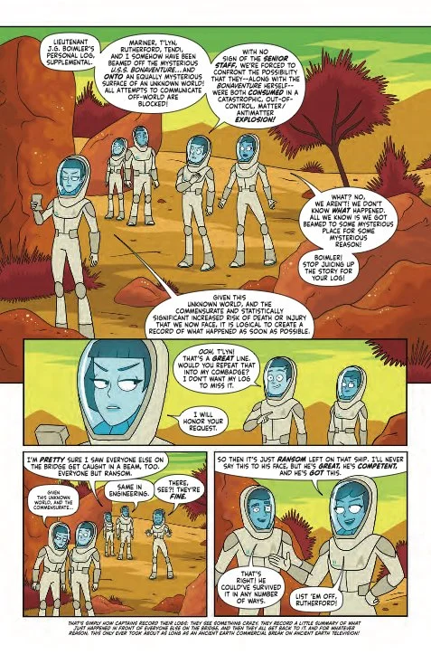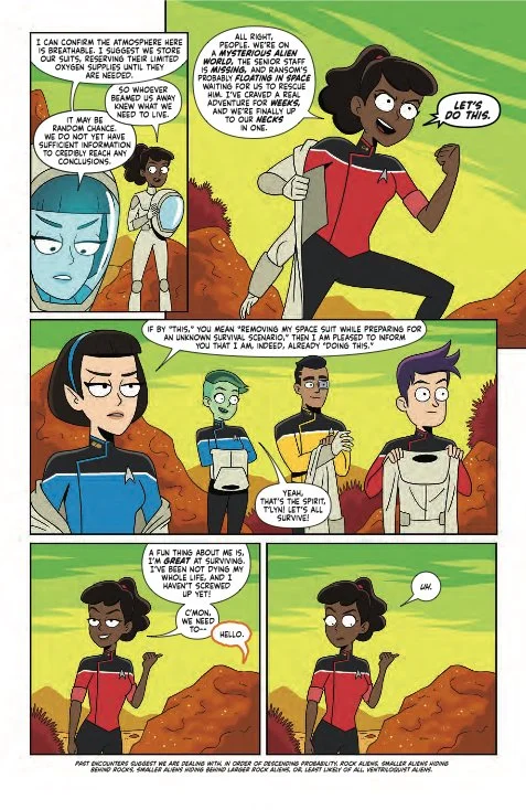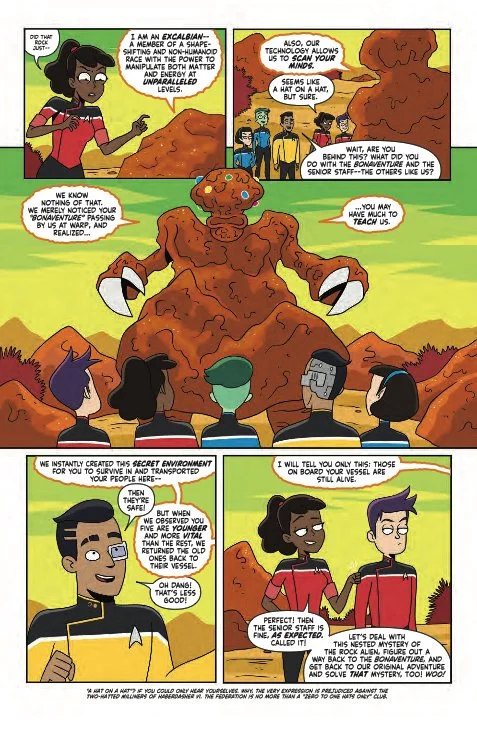 Mariner, T'Lyn, Rutherford, and Tendi have beamed off the mysterious USS Bonaventure and onto an equally mysterious surface of an unknown world, significantly raising the statistical likelihood of death and injury! Finally, the crew is up to their necks in adventure. There's the senior staff's safety to confirm, a weird planet to escape, and an alien race that wishes to learn more about mentorship... through a battle royale! Enter Jadzia Dax, Montgomery Scott, Kathyrn Janeway, T'Pol, and Jean-Luc Picard as the mentors and the Lower Deckers as the mentees. May the best student live!
