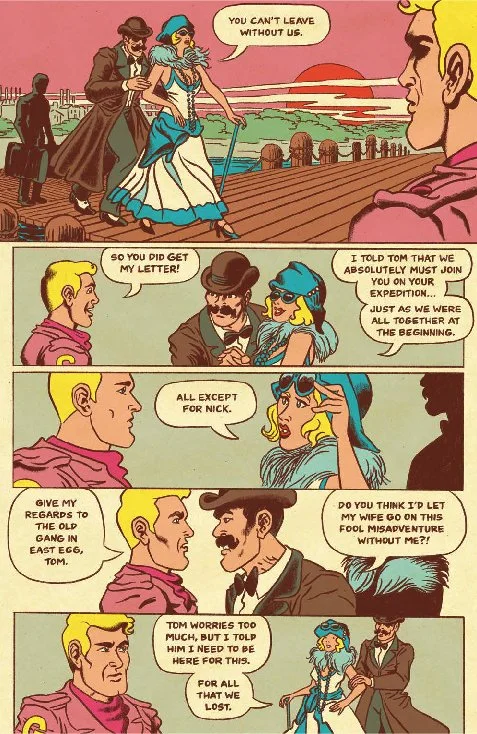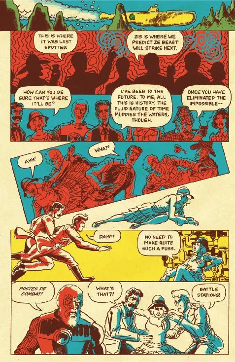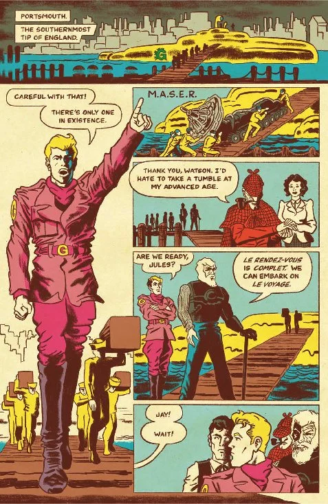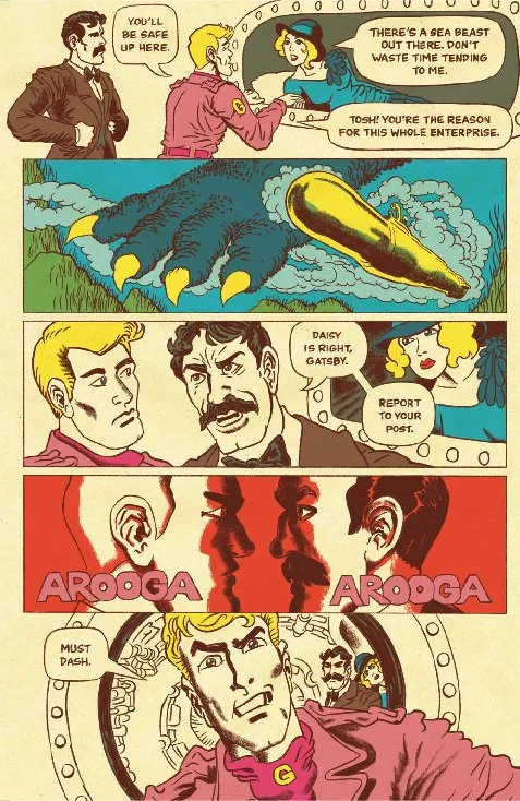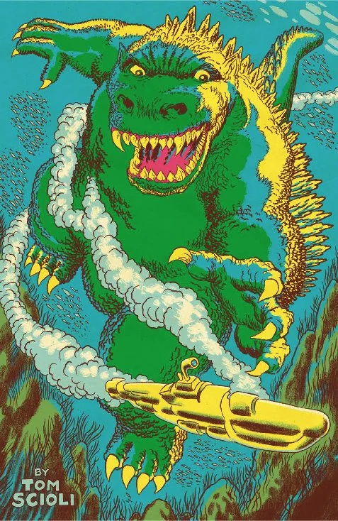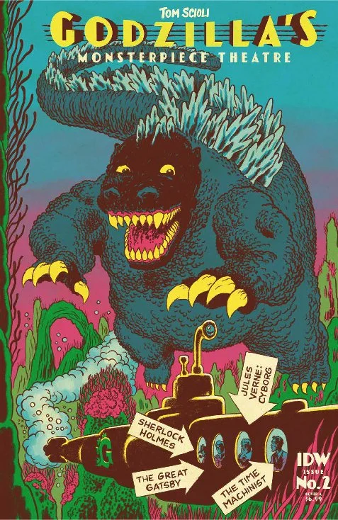 The roar of the twenties escalated to a mighty SKREONK as Godzilla attacked the party of the wrong man and hurt the wrong lady. Now Jay Gatsby has enlisted the help of Sherlock Holmes, Thomas Edison, Jules Verne, The Time Machinist, and more to put an end to the Godzilla threat once and for all. Watch as our new team travels twenty thousand leagues under the sea and turns Paris into the ultimate Godzilla trap in this thrilling feat of cartooning by the unrivaled Tom Scioli.