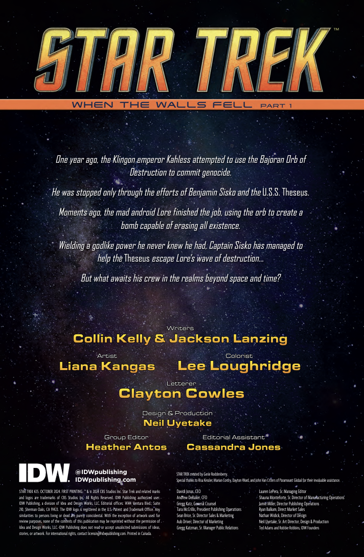New Arc Starts Here! The android Lore has done the unthinkable: He has detonated the Orb of Destruction, unmaking the universe. After an extra-galactic tumble on the ensuing shockwave, the Theseus sinks into fluidic space. There, the crew melds in and out of a manifold of realities. Benjamin Sisko is against a godkiller once again, but this time it's up to him alone to save reality itself!