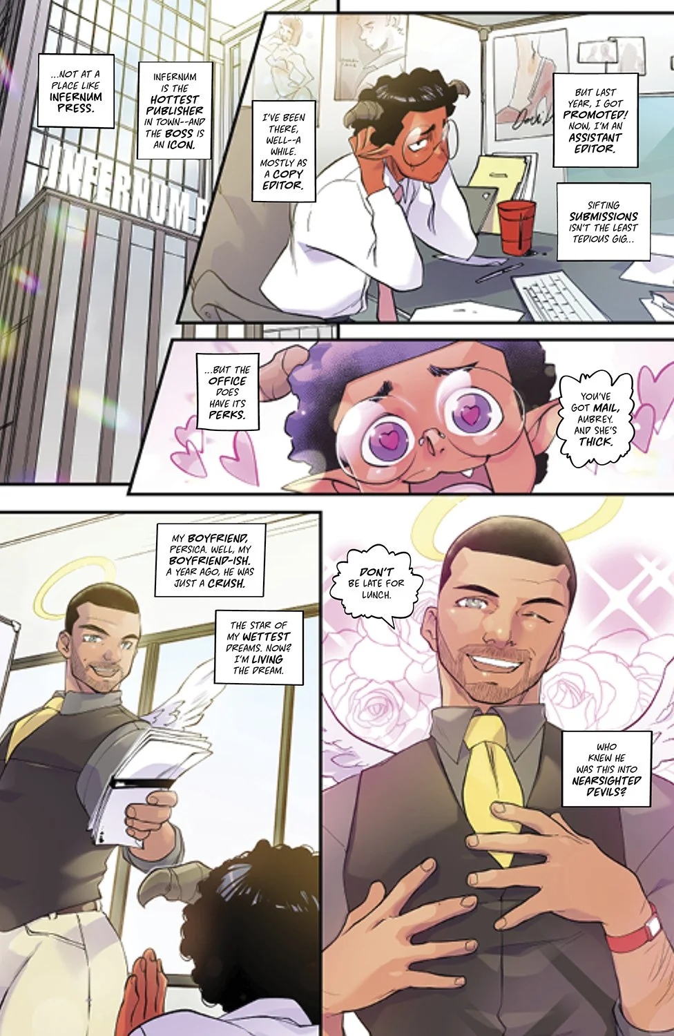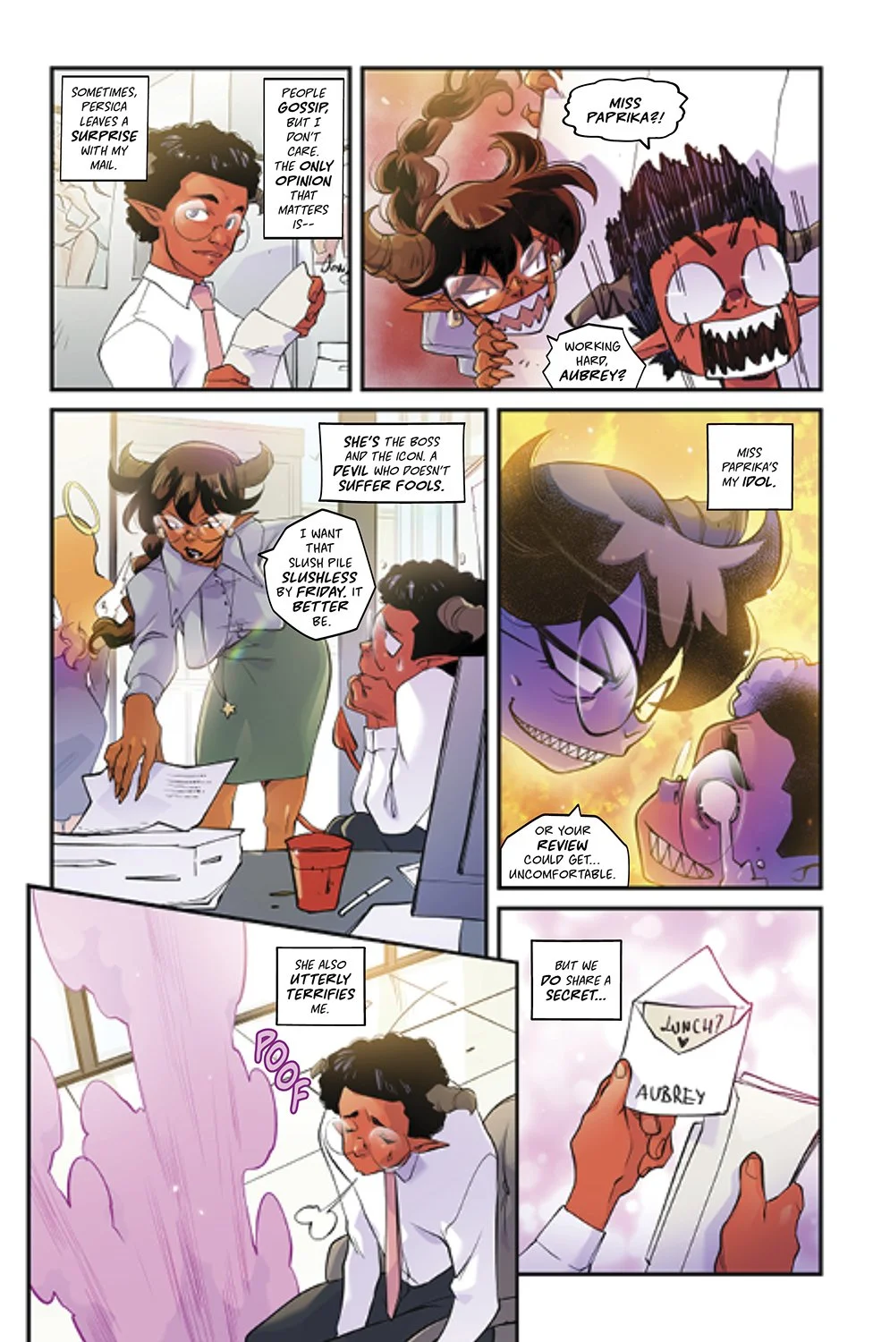 Sweet Paprika: Open For Business follows Aubrey Jean, a young employee at Infernum Press, as he tries to impress his hero and boss, Miss Paprika, and figure out his relationship with Persica, a friend with benefits who might want to be more. But just as Aubrey and Persica settle into an open relationship that’s comfortable for them both, their relationship is thrown into turmoil by Kren. And on top of all that, Aubrey finally gets a chance to prove his worth to Miss Paprika by becoming the handler for Infernum Press’s most challenging client—the dreaded, eccentric, and unstable author known as Durian.