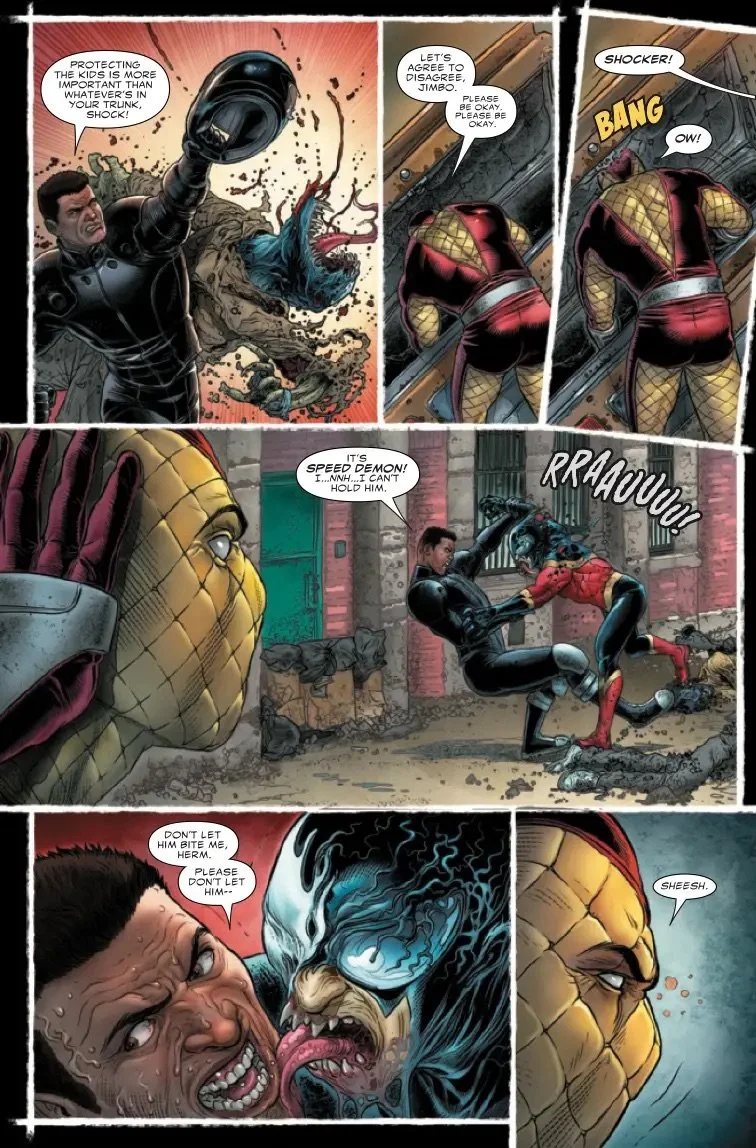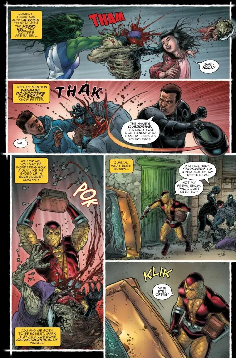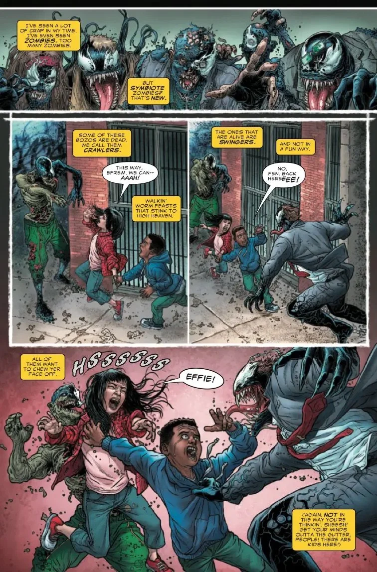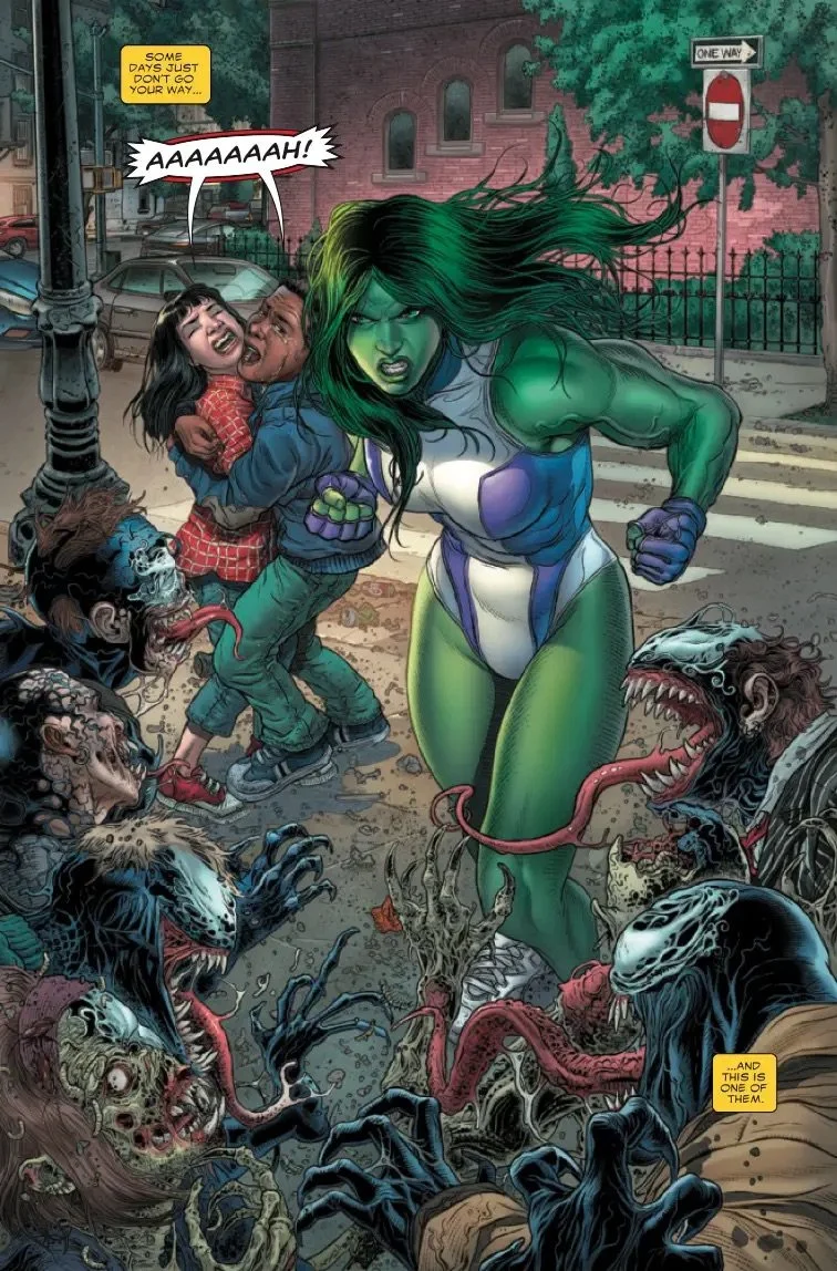 As the two VENOMS fight, a darker strain of symbiotes - the ZOMBIOTES - slither across New York City. The dead are reanimated into CRAWLERS! The living possessed as SWINGERS - all intent on turning the entire city into mindless killing machines! An unlikely team - led by SHE-HULK, HELLCAT and SHOCKER - could be humanity's only hope!