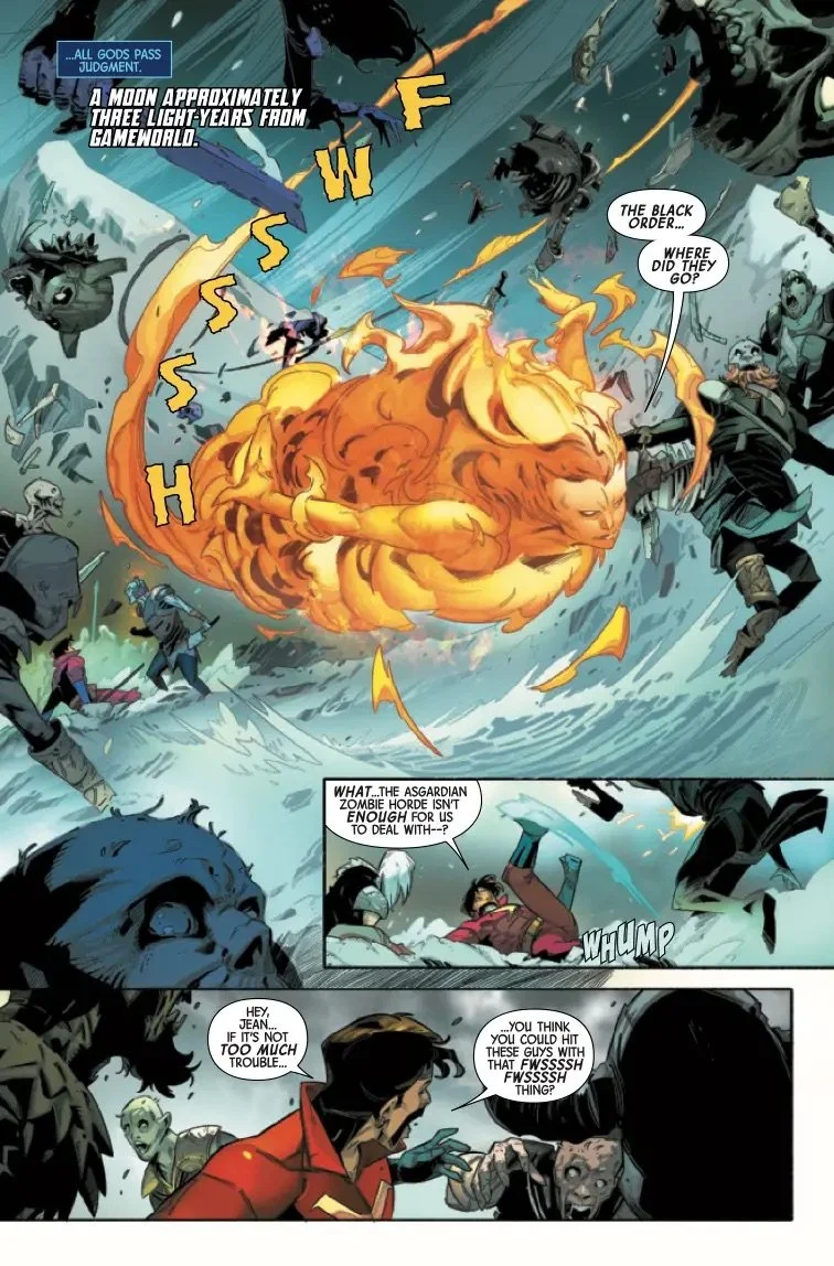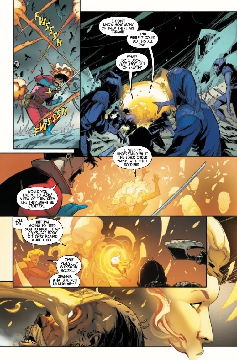 Saving a planet full of kidnapping victims who've disappeared from the gaudy whirlwind of Gameworld - seems like just another day in space for JEAN GREY! Though...she did get the tip-off from her less-than-forthright father-in-law, legendary pirate CORSAIR of the STARJAMMERS crew...and the kidnappers are none other than the children of Thanos themselves, the dread BLACK ORDER. And yet...somehow...it's all about to get a whole lot worse!