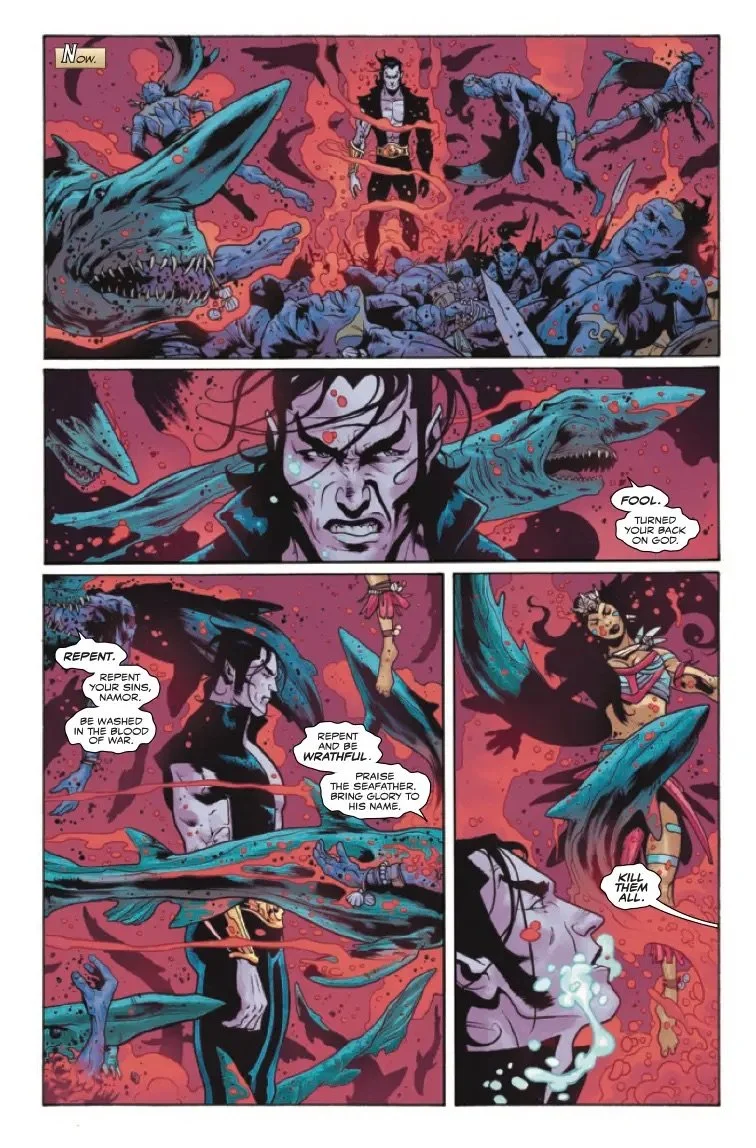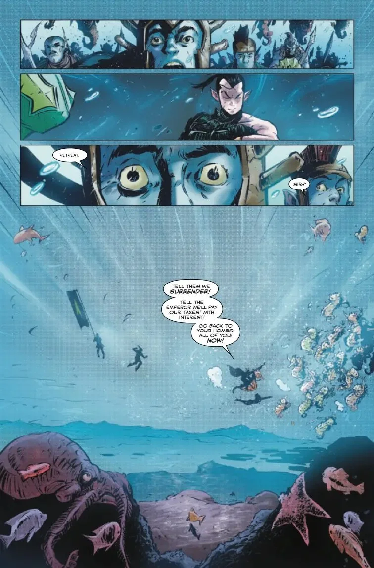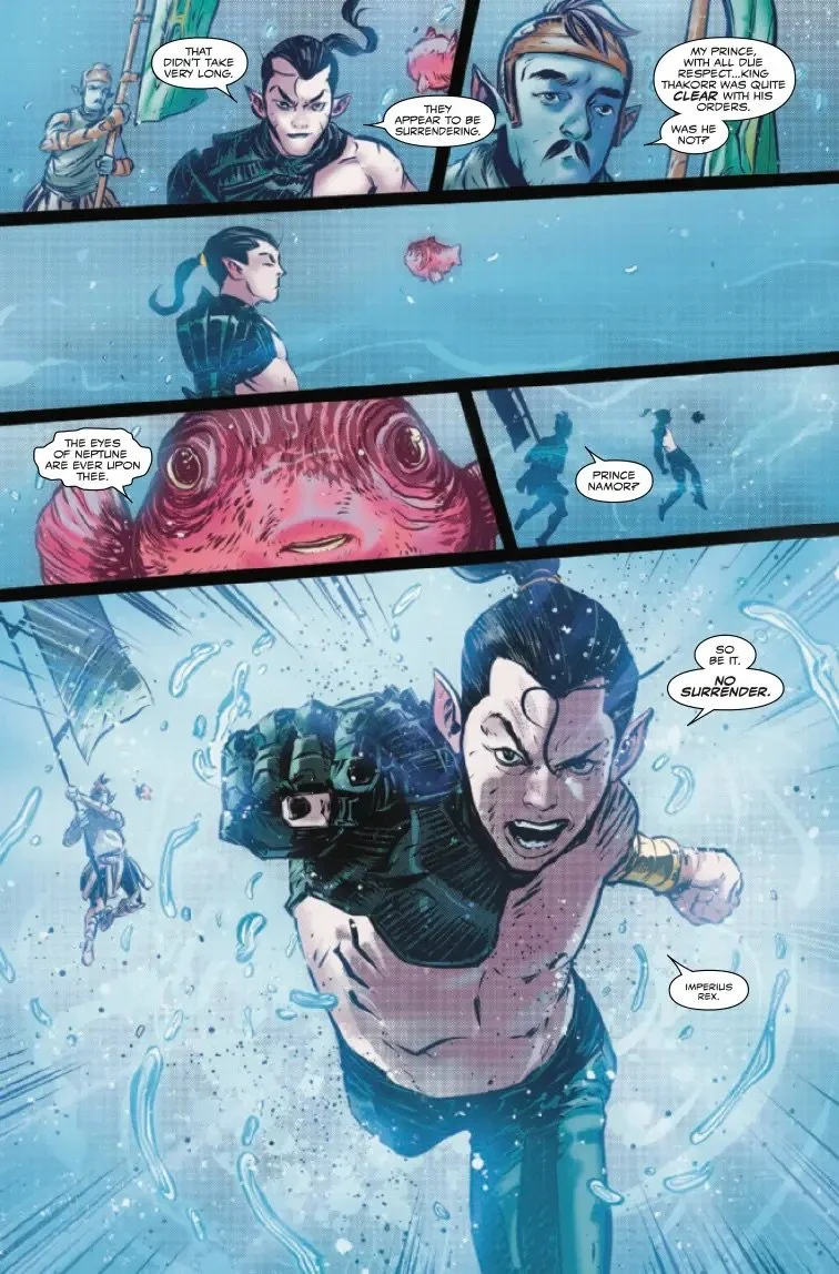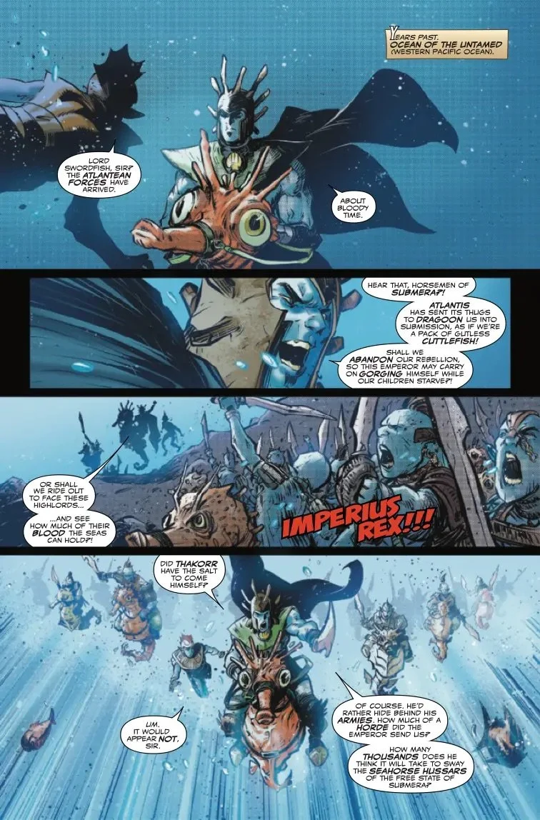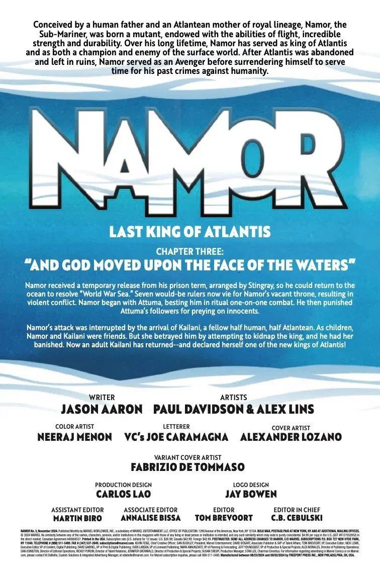 Seven Kings Battle to Rule the Seas! War has engulfed the undersea realms, from the ruins of Old Atlantis to the sunken forests of the Seaweed Men. While in the mysterious depths of the Secret Seas, Namor's vicious past comes back to haunt him.