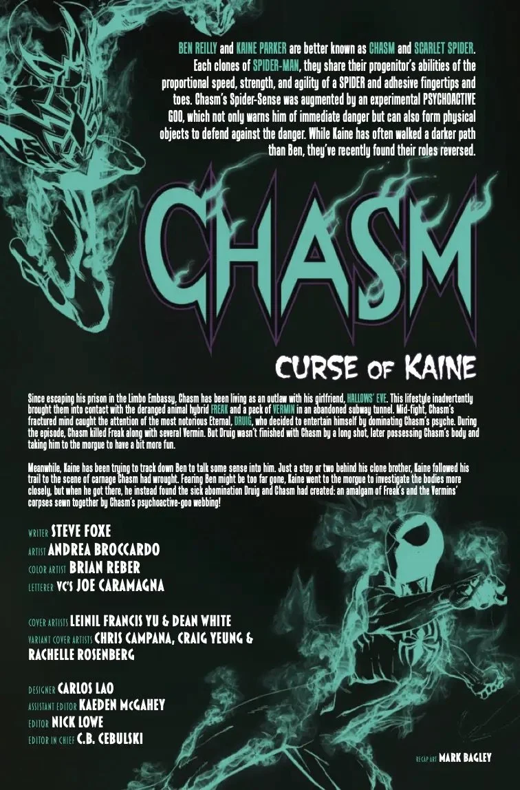 Chasm's brain has been manipulated more than once...by the Jackal, by the Beyond Corporation... But now someone even more terrifying is digging fingers into the brain of poor Ben Reilly...and his only hope? Kaine Parker, his fellow Peter Parker clone, who at this moment very much believes that the only solution to Chasm is DEATH.