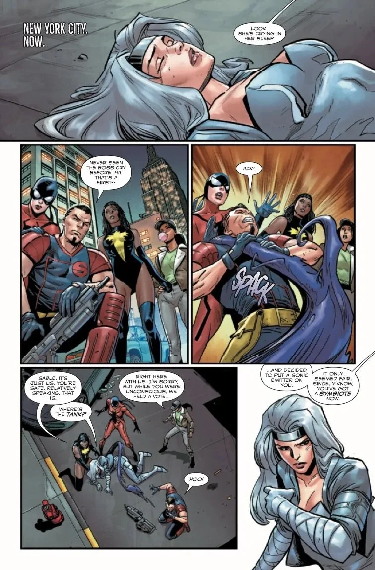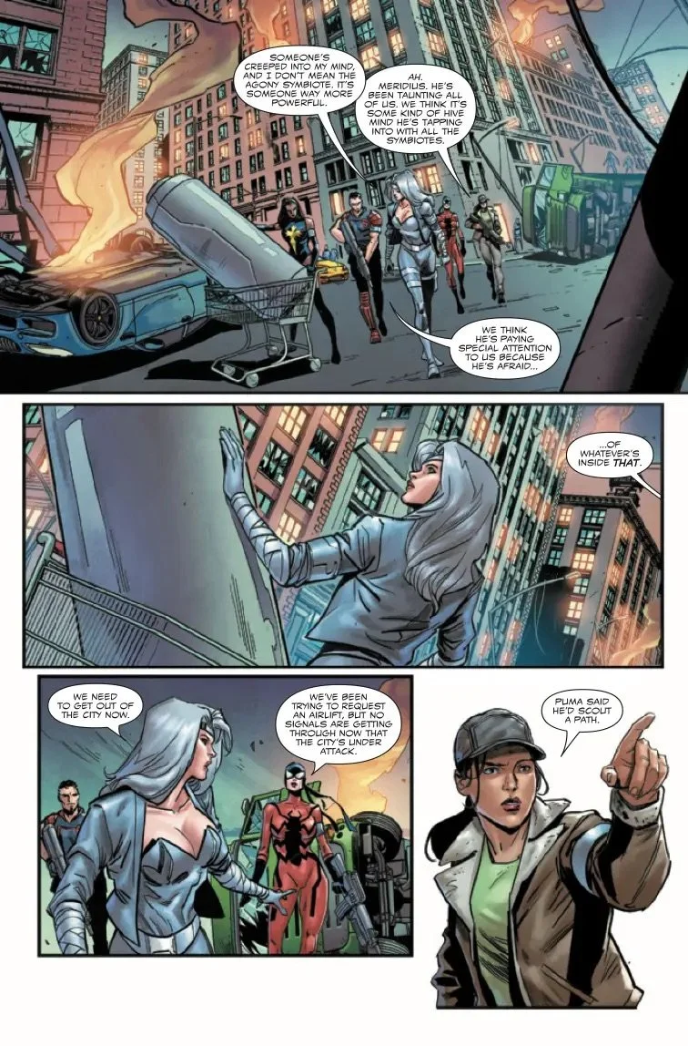 The AGONY symbiote chooses its next host - SILVER SABLE! The new Wild Pack becomes a terrifying and lethal SYMBIOTE SQUAD to stop the monstrous horde of ZOMBIOTES spreading like a plague across NYC - with extreme prejudice! But can Sable and her alien partner still be trusted?! And what dangerous secret rests within their mysterious cargo?