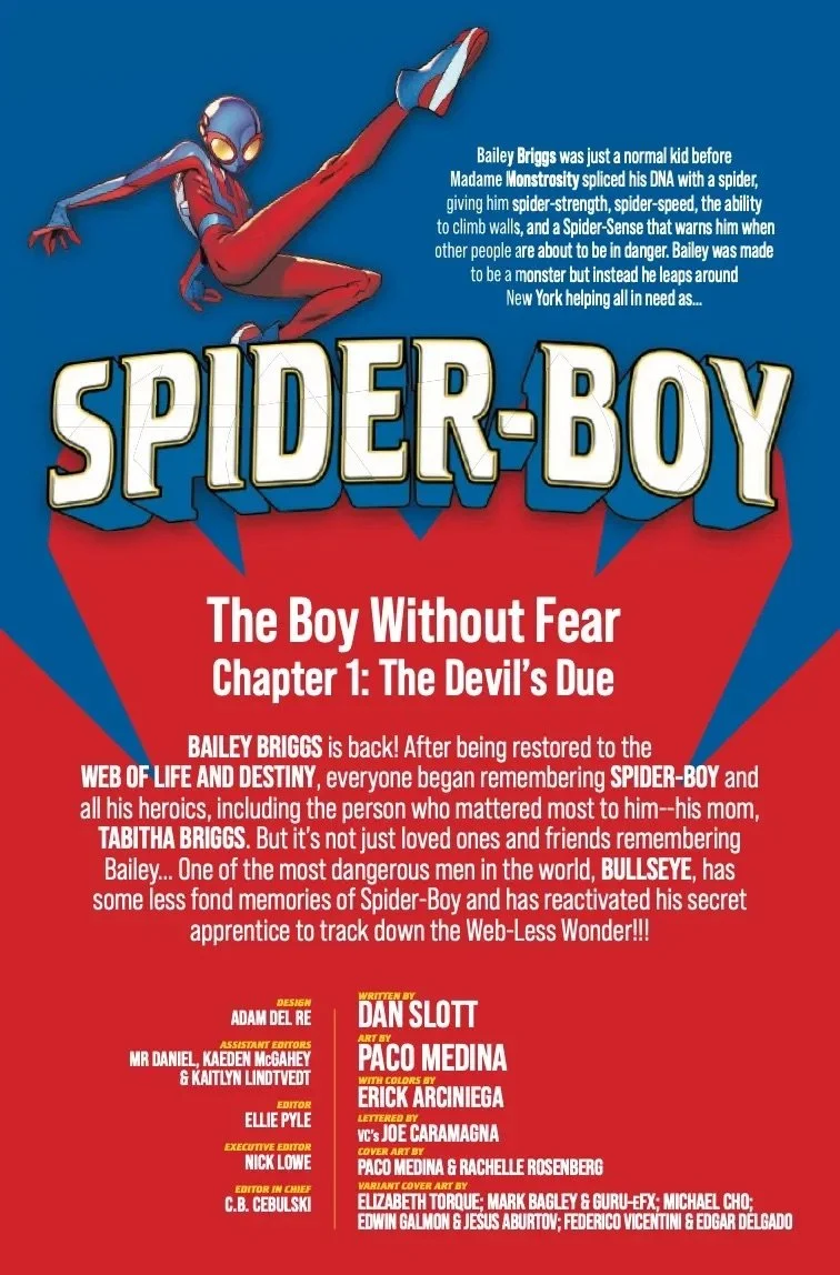 We were NOT kidding! After the recent status quo shake-up, Spider-Boy's life really will NEVER be the same again! In light of what happened, maybe it's time for Bailey Briggs to be someone else's sidekick. Get ready Daredevil, because here comes The "Boy Without Fear"! Also in this issue: Bullseye and the secretest secret character of them all.