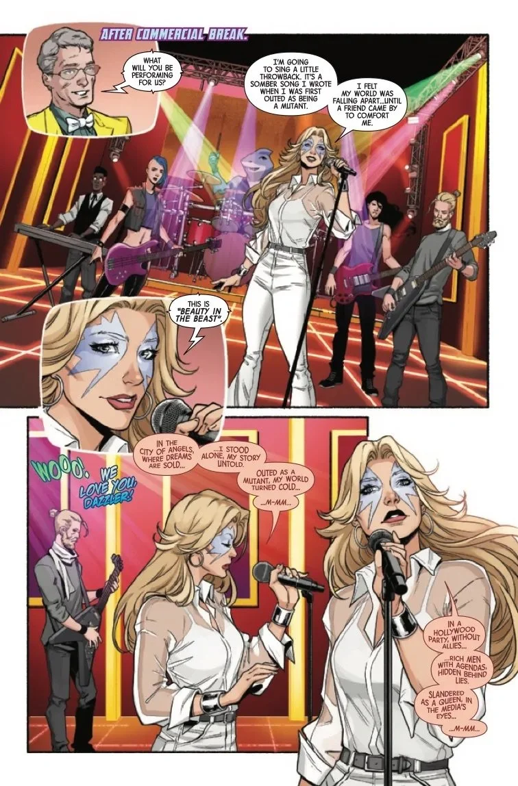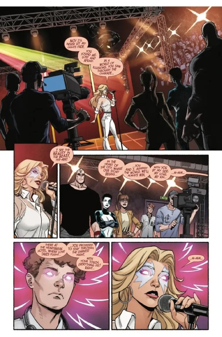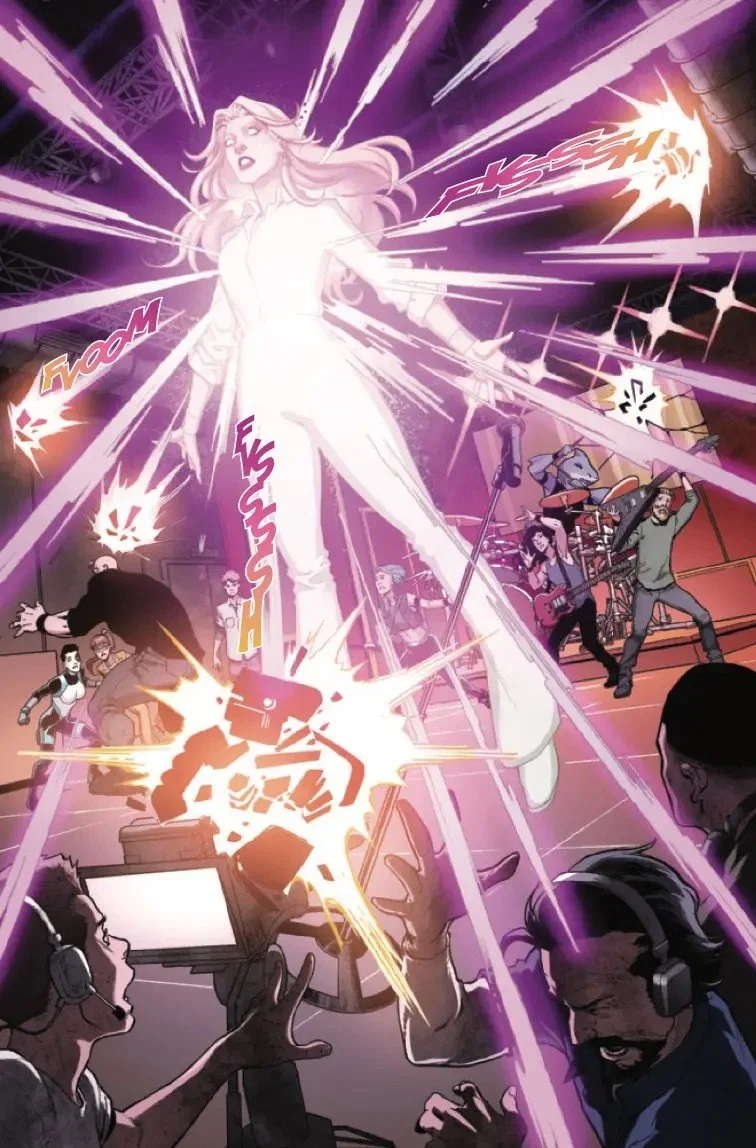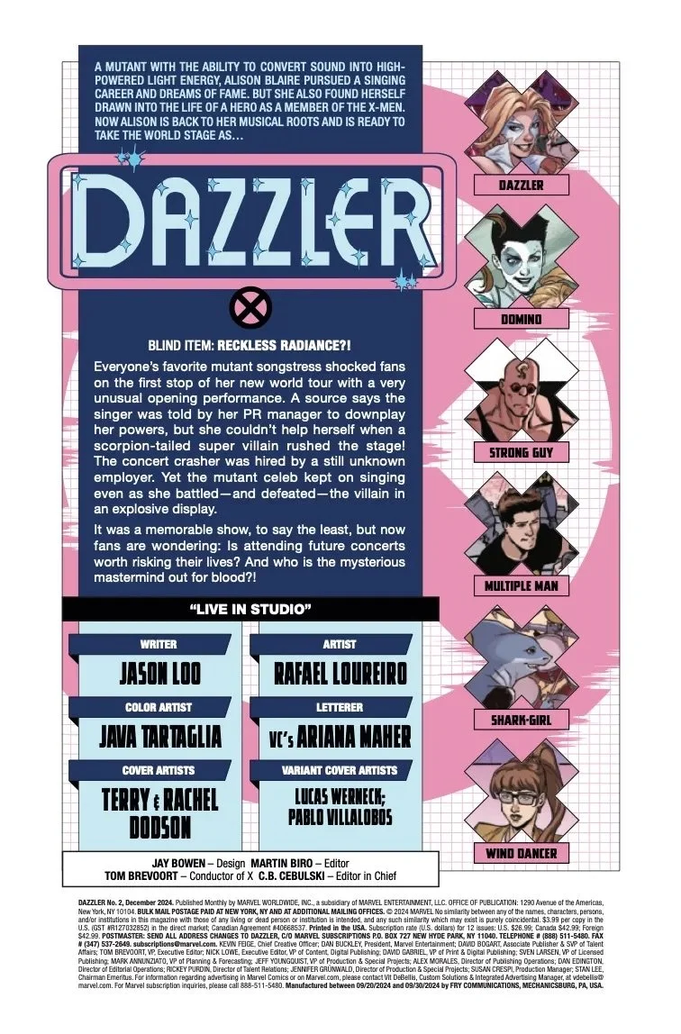 London Calling! DAZZLER and her entourage travel across the pond for the next stop on her world tour. But when a live studio session goes dangerously awry, it's time for DOMINO and STRONG GUY to shine! But who is the mystery villain out to cancel Dazzler's performances - permanently?! Featuring action, heartbreak and another original set of song lyrics!