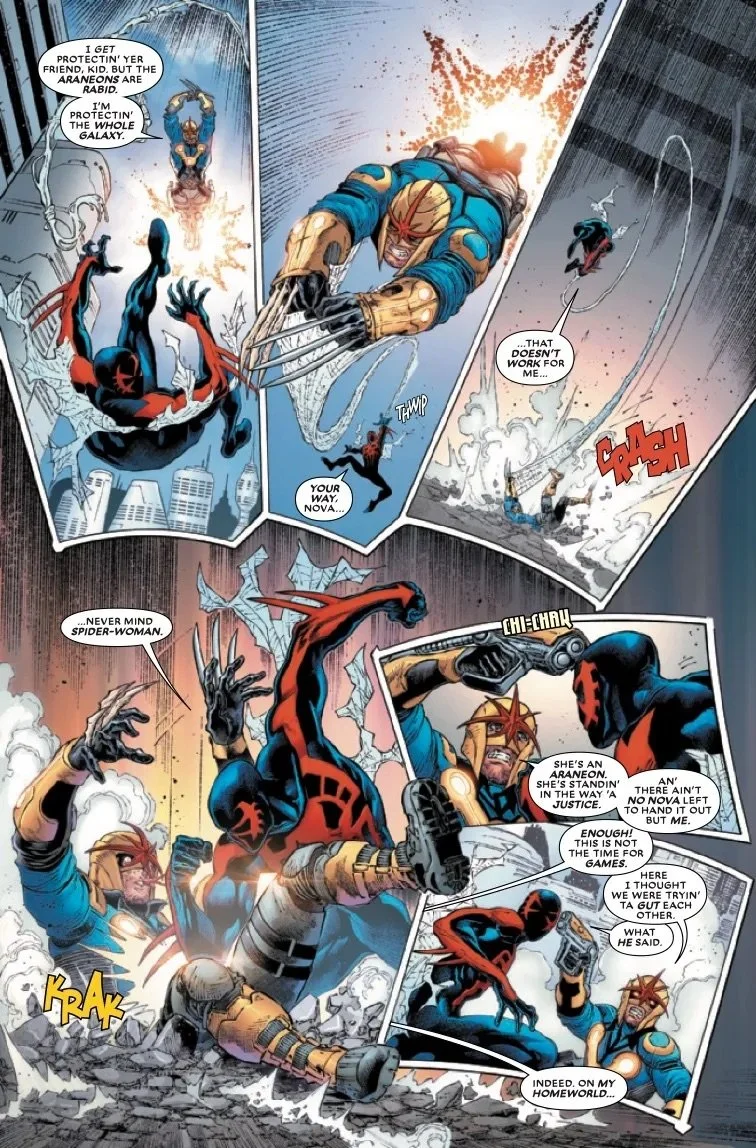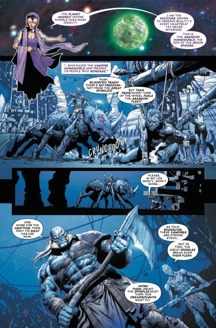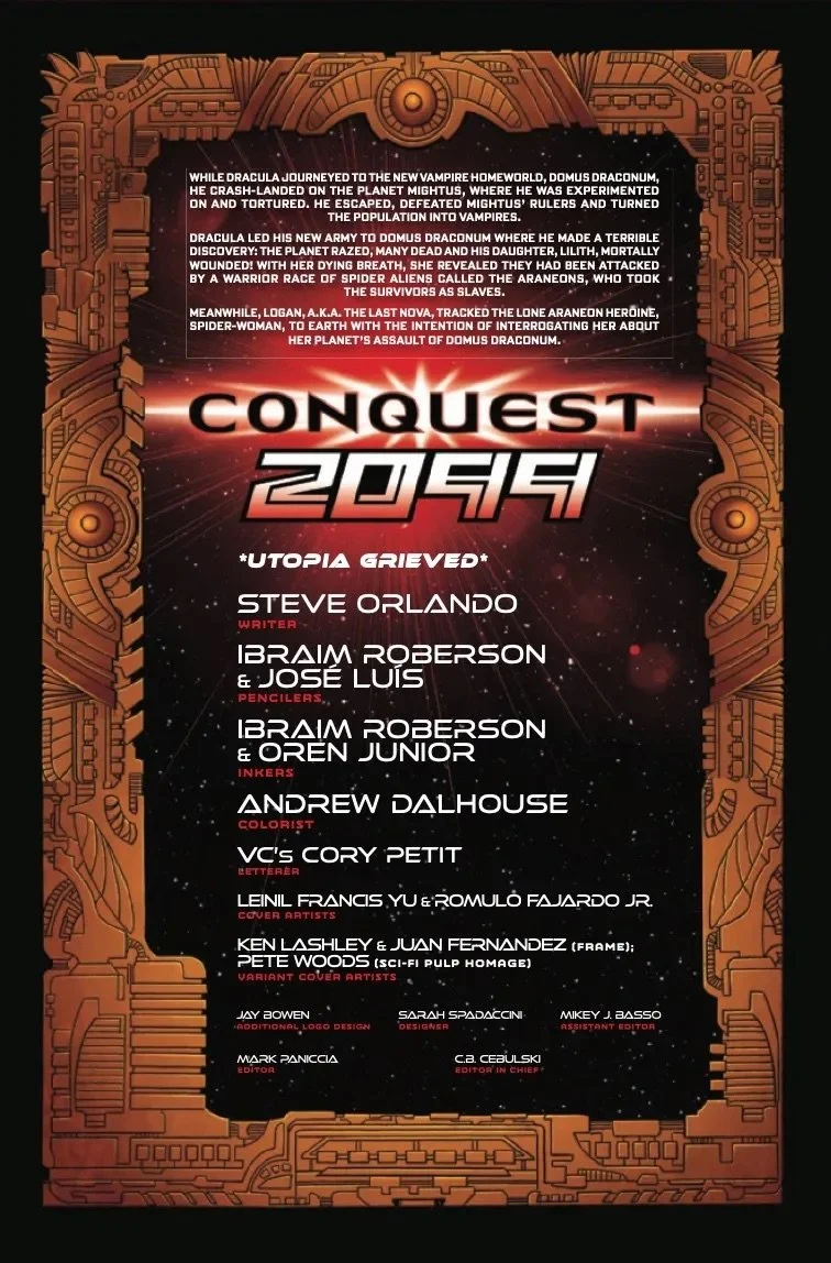 DRACULA'S bloody war on SPIDER-WOMAN 2099's people, the ARANEONS, has begun! NOVA and SPIDER-MAN battle for the fate of Spider-Woman, while the X-MEN 2099 take on another front of the battle! But the brutal vengeance draws forth the cosmic angel of death - the SILVER SURFER of 2099! Featuring the first appearance of WEB-WEAVER 2099!