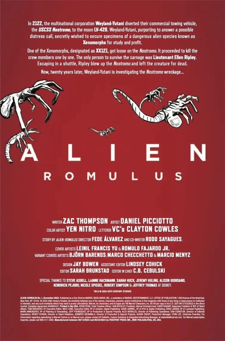 Following the theatrical release of the highly anticipated blockbuster Alien: Romulus, Marvel Comics presents an all-new story revealing secrets of the film's legendary antagonists! How did Xenomorphs find Rain, Andy and their scavenger crew? Familiar faces lurk in the shadows; and this issue shines light on them all! Horror master Zac Thompson (ABSOLUTE CARNAGE, X-MEN) and rising star Daniel Picciotto (GHOST RIDER, X-FORCE) collaborate directly with filmmakers for this must-have collector's item!