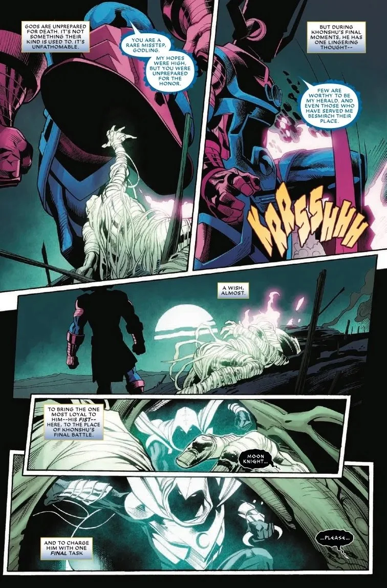 When Khonshu, the Moon God, and Galactus, the World-Devourer, clash, Moon Knight is caught in the middle! To keep the peace, Moon Knight becomes the newest herald of Galactus-but his alters cause the Power Cosmic to manifest in startling new ways! Unless Moon Knight can conquer his new powers-and a few former heralds-the Earth itself faces extinction!