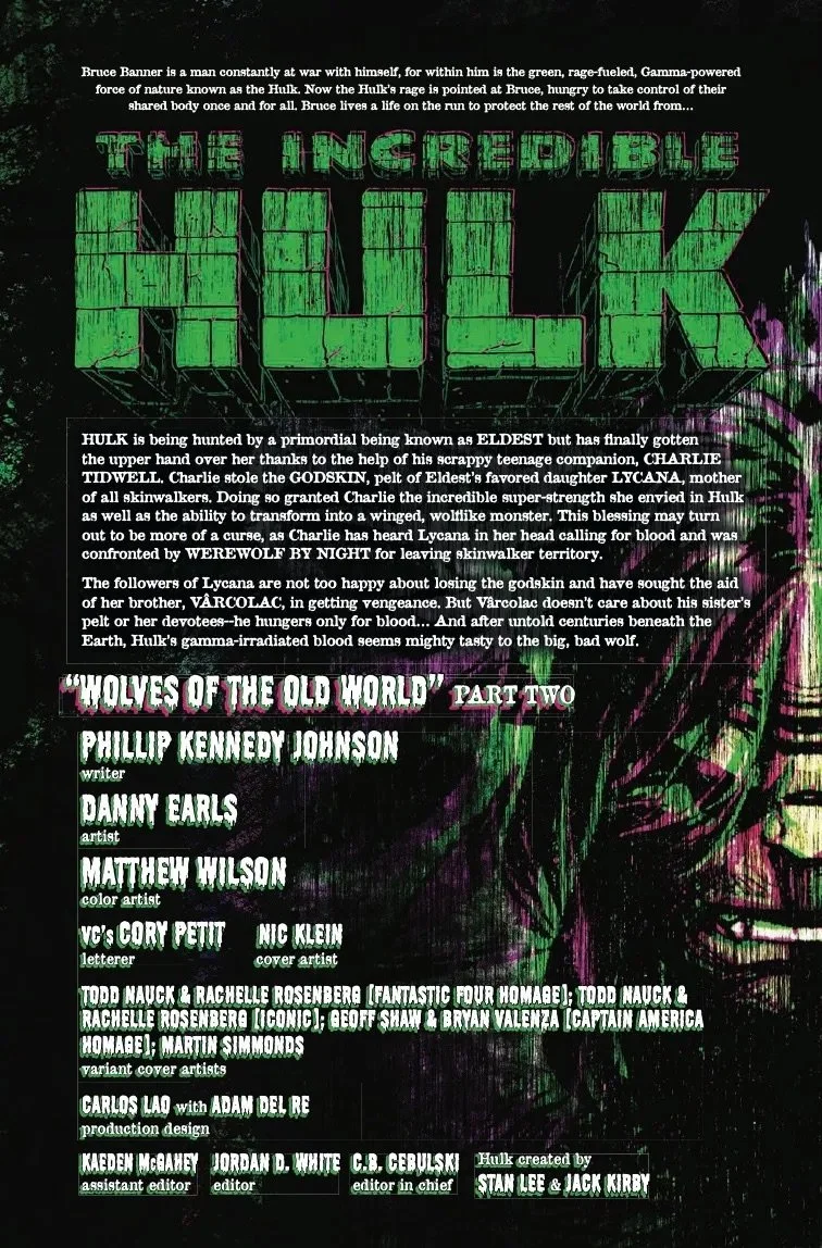 The INCREDIBLE HULK and WEREWOLF BY NIGHT face off against the immortal wolf-demon VARCOLAC, as Hulk's destruction of the Skinwalker Cult attracts the attention of the oldest, most horrifying forces on Earth. Meanwhile, Charlie revels in her new strength, and her childhood fantasy of becoming a super hero seems within reach after all but as she continues to change in terrifying ways, she's not sure if she's still one of the good guys.
