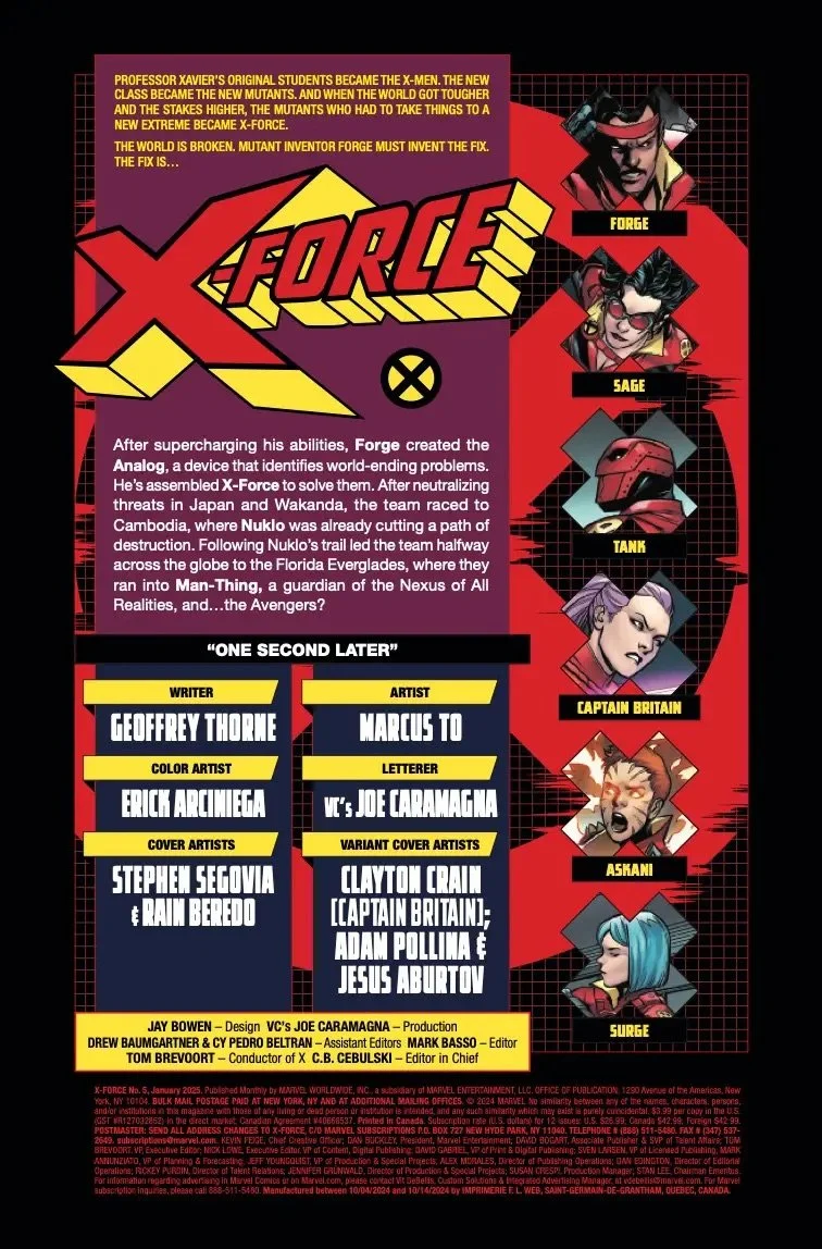 Attacked from all sides, with a team member's DEATH in the offing, and struggling to accomplish their mission, X-Force fights to seal the latest and worst Fracture Node threatening the Earth. Can X-Force pull through, or will they fracture and doom the world? The most surprising X-book of the season is just heating up - if you haven't been reading it, now is the time to JUMP ABOARD!