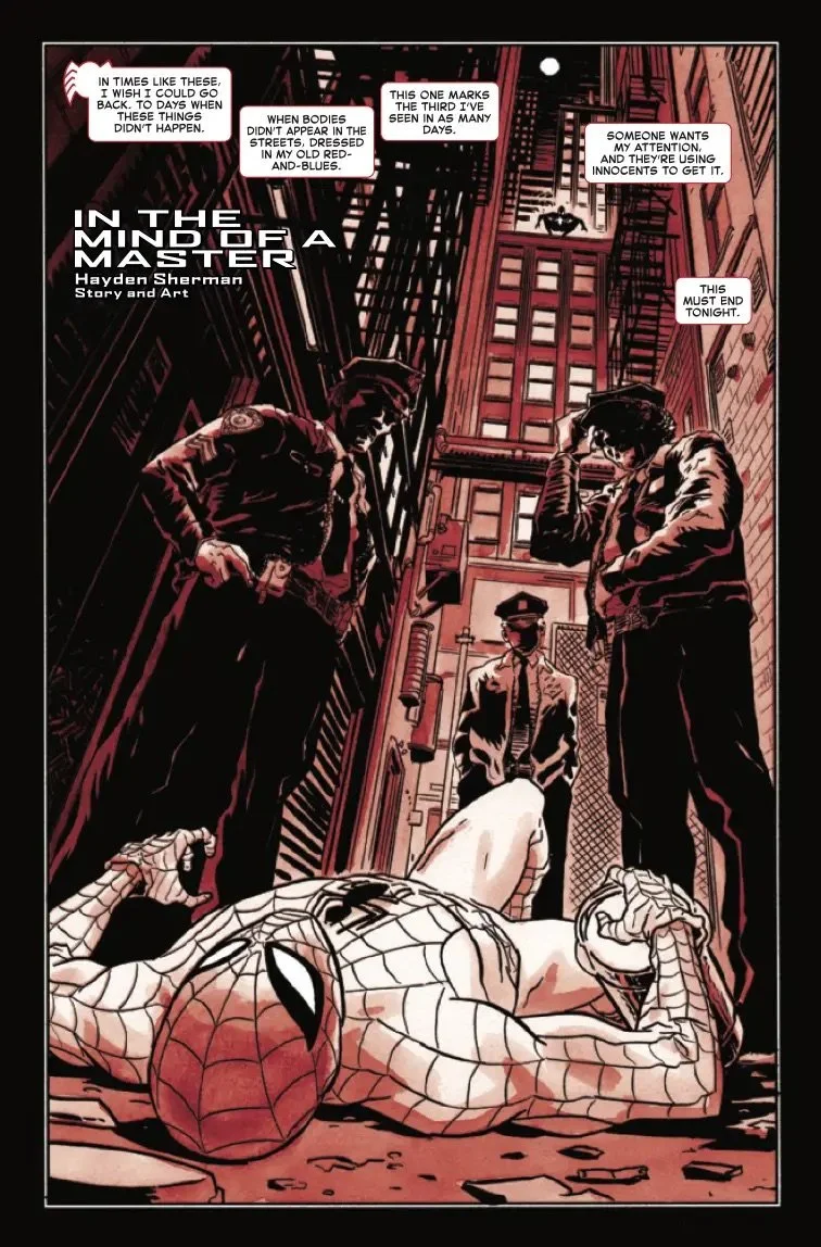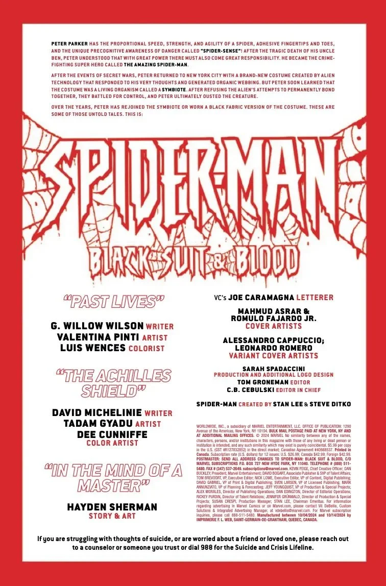 Celebrate the 40th anniversary of SPIDER-MAN's black costume - "BLACK, WHITE & BLOOD"-style! Iconic AMAZING SPIDER-MAN scribe and Venom co-creator DAVID MICHELINIE returns to utterly upend the web-slinger's world! G. WILLOW WILSON teams Spidey up with the Black Cat for a heist that will challenge everything Peter believes in! And rising star HAYDEN SHERMAN's nail-biting tale sends Peter Parker on a dark, twisted journey when a foe out of his past returns hungry for vengeance - and to force Spider-Man to confront old sins!