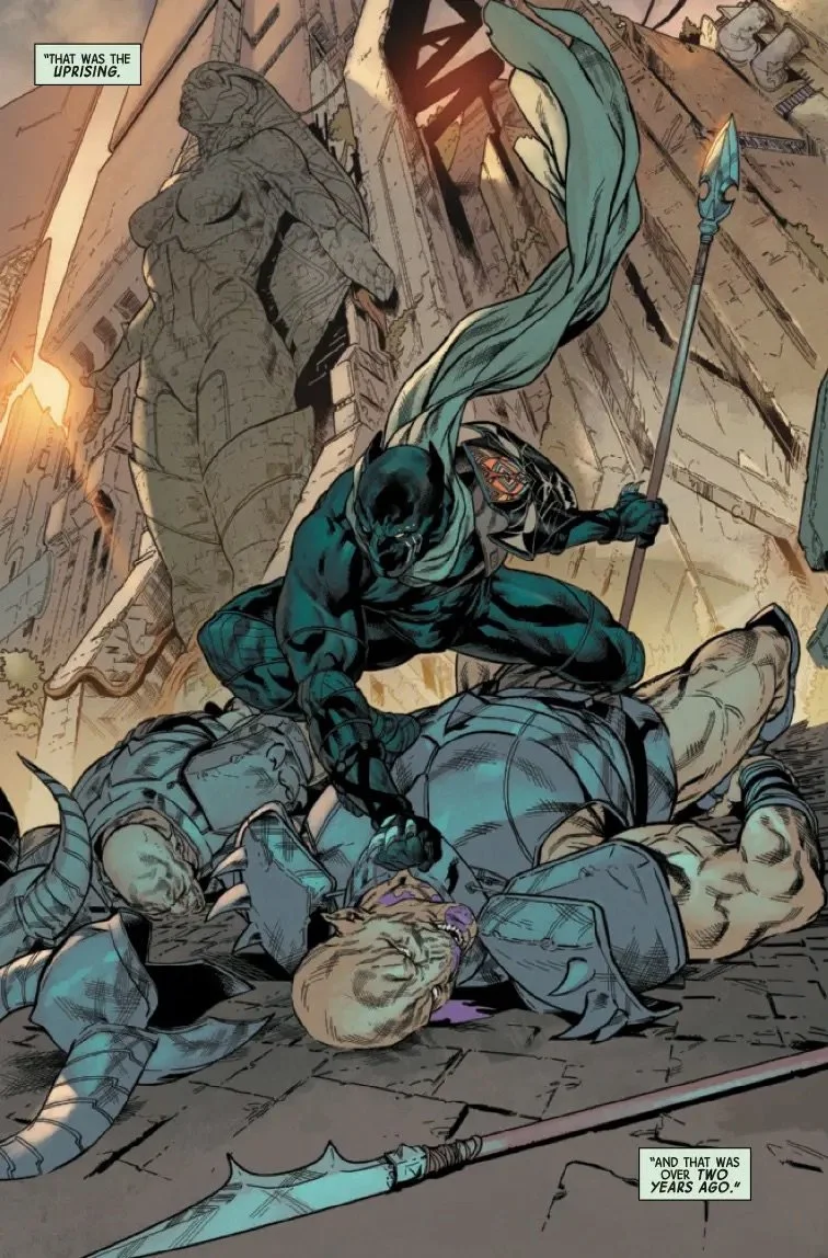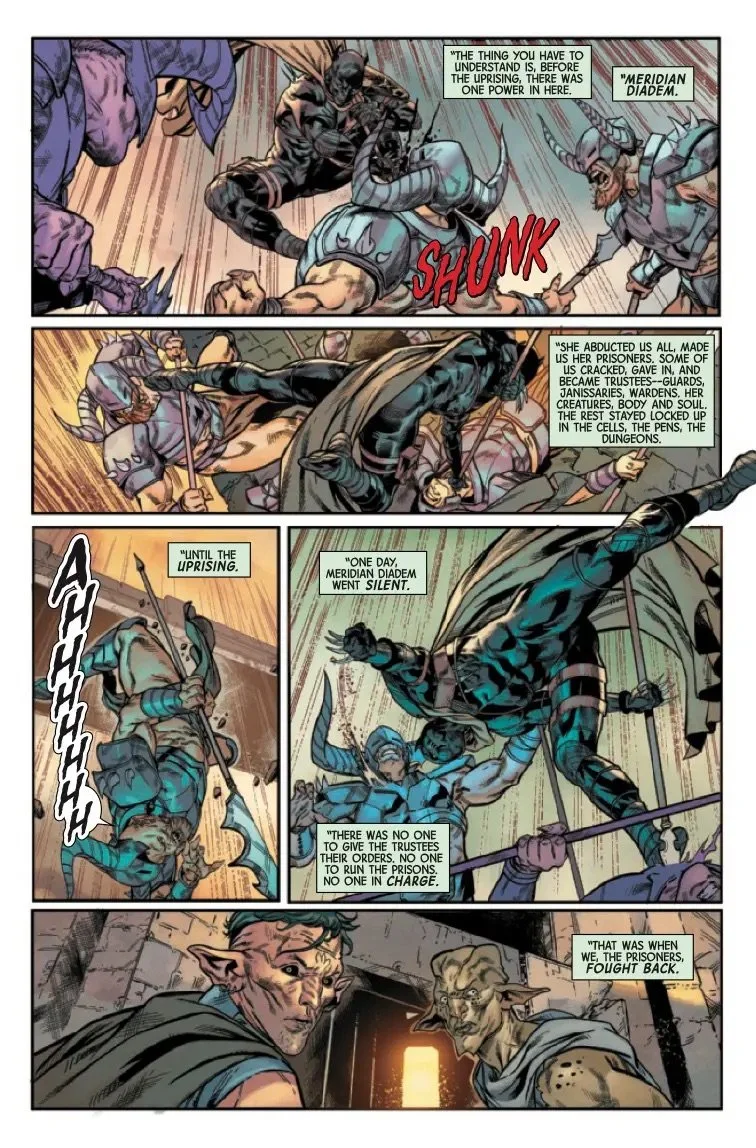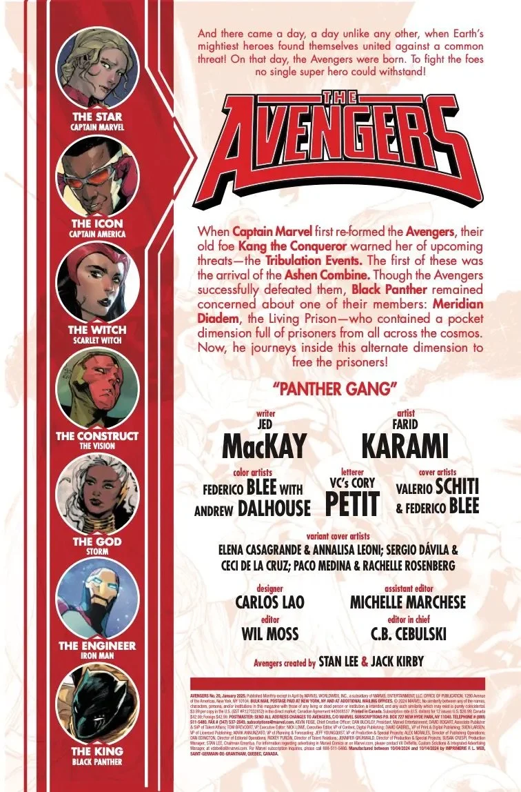 Black Panther stars in this issue as he journeys into the pocket dimension of Meridian Diadem! While the Avengers deal with Doctor Doom on the outside, T'Challa must rescue the prisoners trapped within the Living Prison...