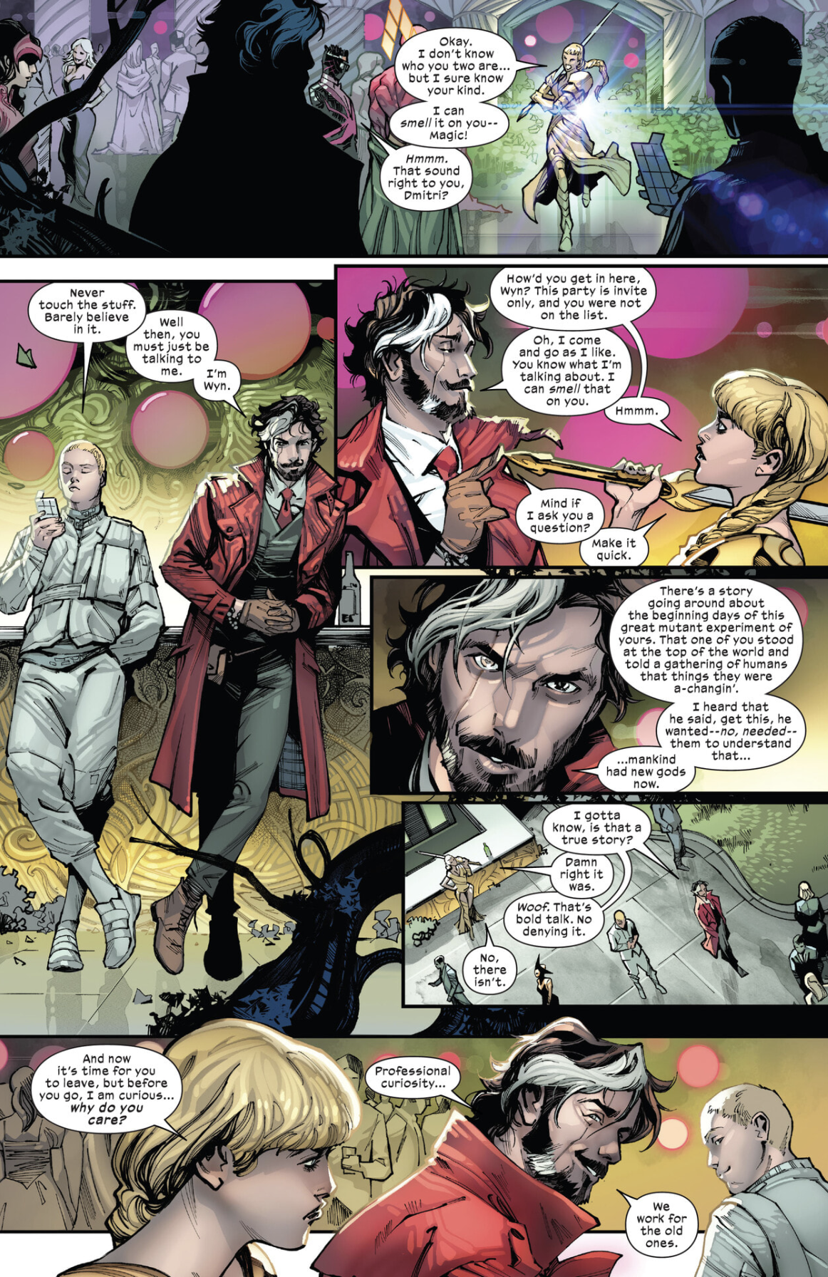 Created by Krakoan architect Jonathan Hickman along with Valerio Schiti, two of Marvel’s G.O.D.S. make an appearance at this year’s Gala as previously teased. Wyn, a magician who has remained in the shadows for thousands of year, and Dmitri, a follower of science with his own secret plans, share an ominous warning with Magik before departing the festivities early.