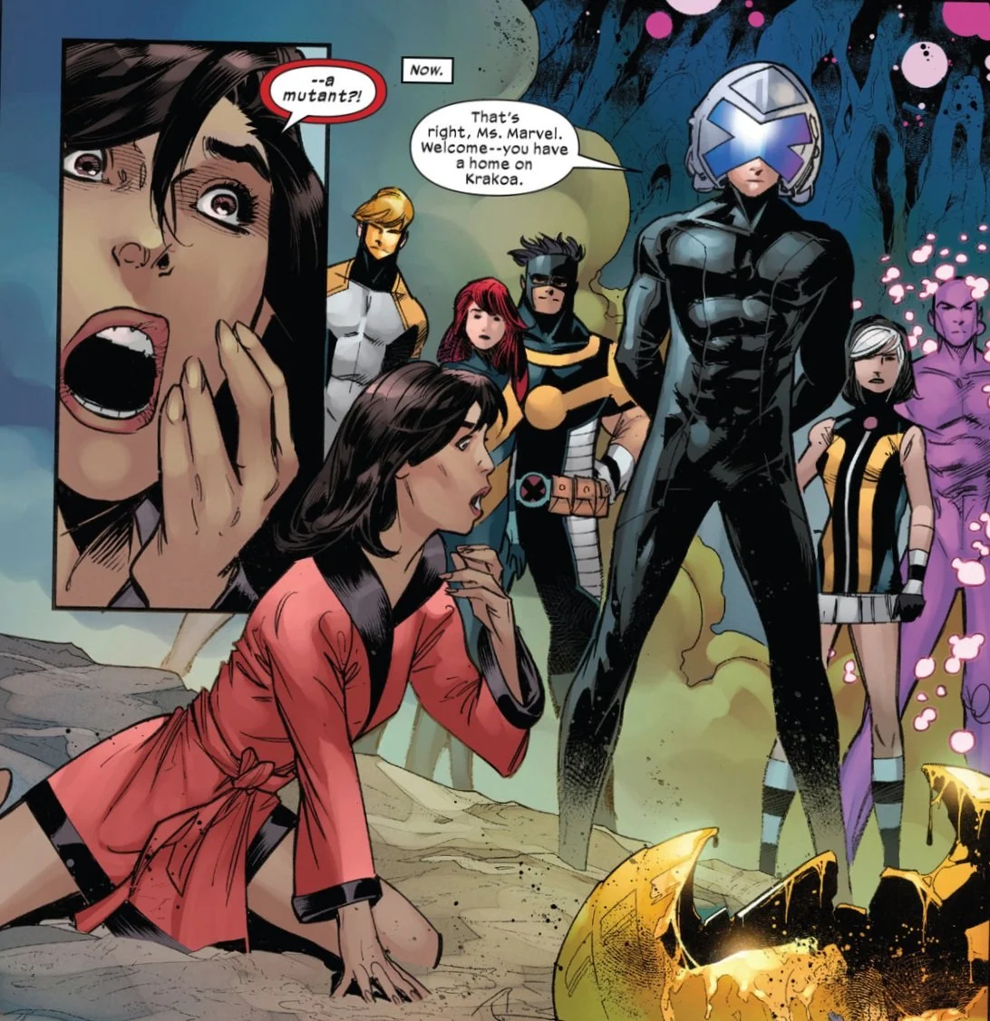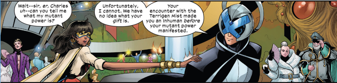 A later scene begins to explain Kamala’s new normal and doesn’t immediately turn her into a full-fledged mutant…yet. We learn that because she was exposed to the Terrigen Mist before her mutant powers manifested, there is no way to know what those powers may be until they reveal themselves. Xavier informs Kamala that there’s no telling what may have had the order been reversed given the negative effects mature mutants have when exposed to the mist. We also see a cute exchange between Kamala and Rasputin IV, who was successfully indoctrinated to be a fan of Ms. Marvel in her future timeline thanks to Xavier’s planned charm offensive/propaganda.