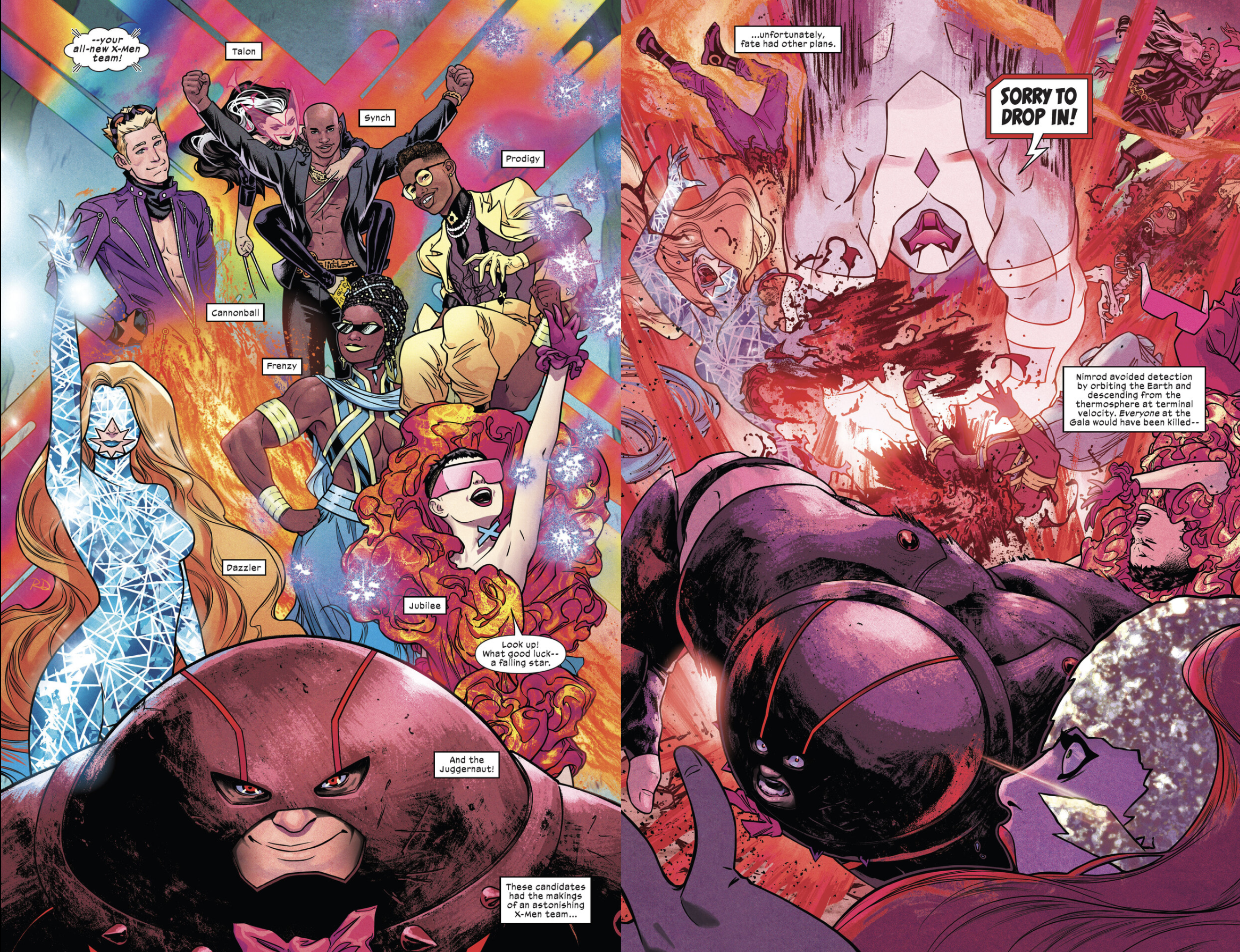 Without even skipping a beat, the celebration is cut short when Nimrod crashes the party on the page immediately after the new team is announced. Combined, the full page spread is one of the most jarring juxtapositions I have seen in comics and it marks a the turning point in Krakoan history.
