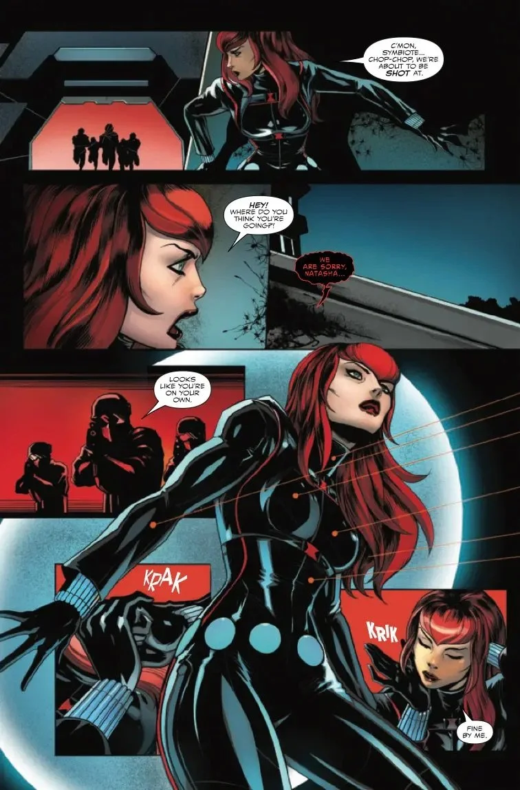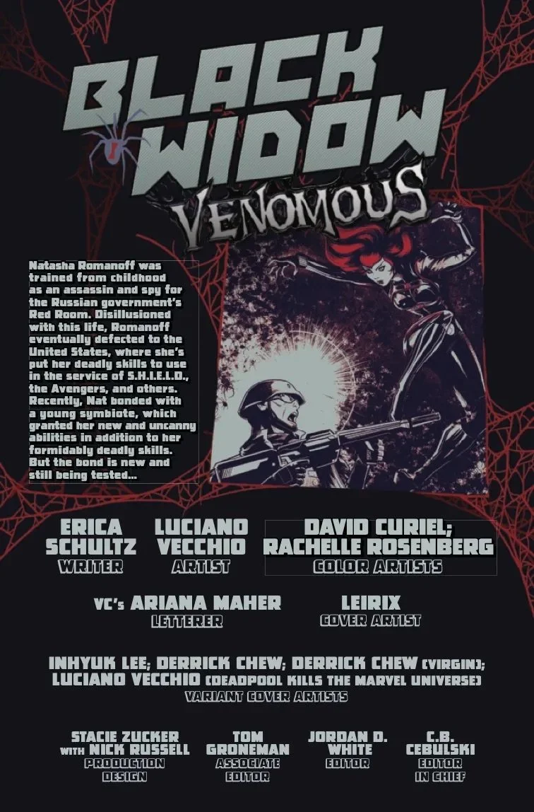 Natasha Romanoff, the infamous spy known as the Black Widow, didn't go looking to bond with an alien symbiote. But a good spy works with all the tools available to her, and when one of the most powerful and versatile weapons in the universe lands in your lap...you take it. Now she just needs to figure out how to work with a weapon with its own drives and desires. Redefining Widow's relationship with her symbiote, and setting the stage for her appearance in Venom War!