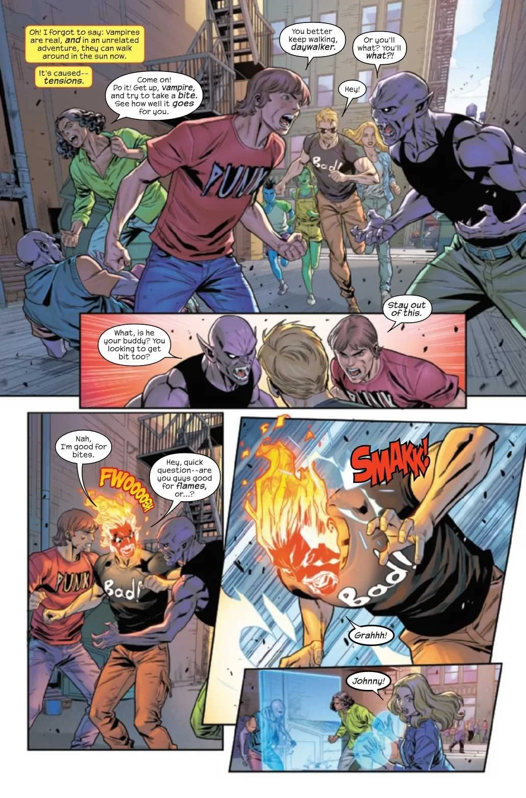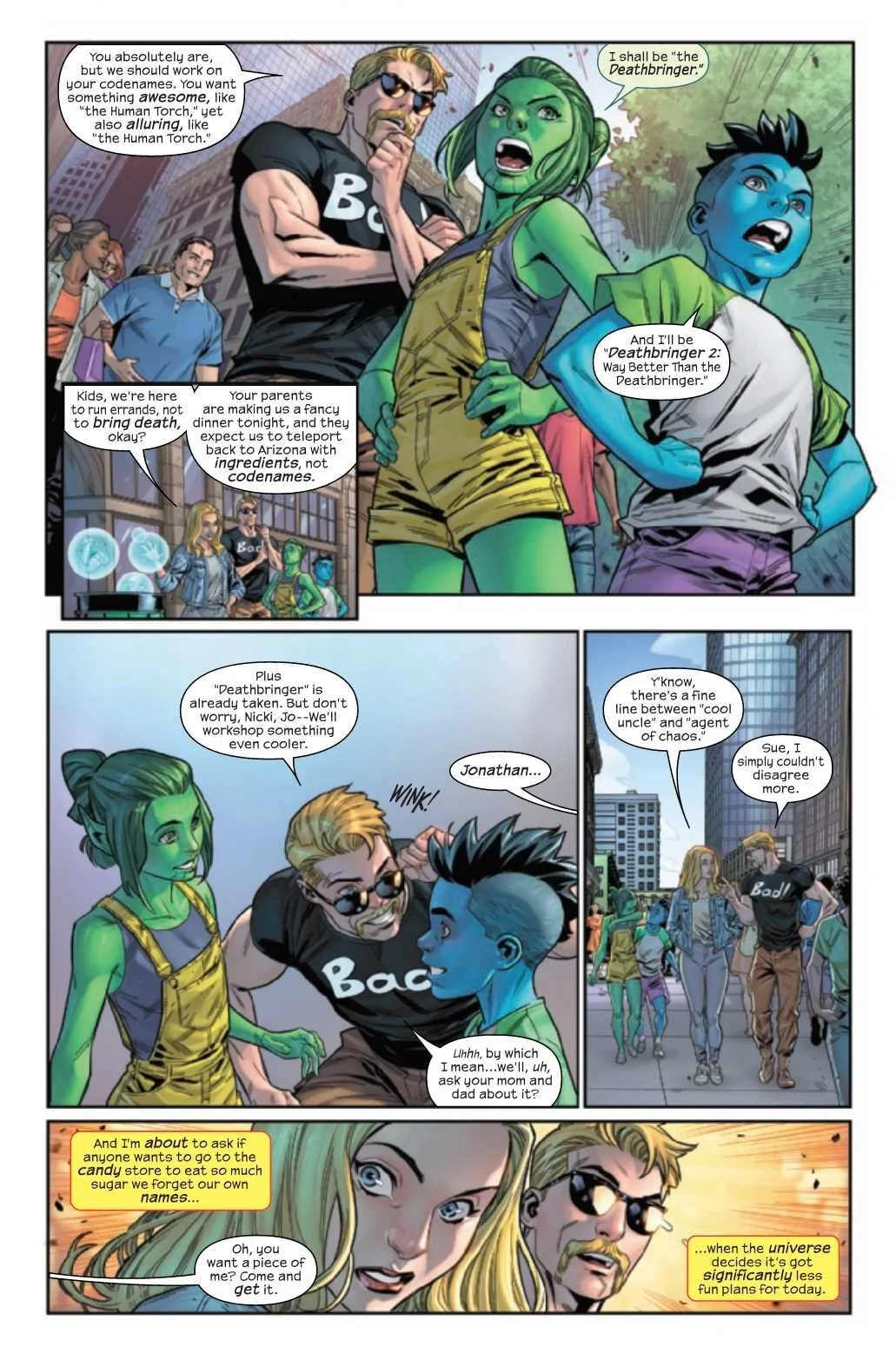 The world is recovering from Blood Hunt, and Johnny and Sue take Jo and Nicki to NYC for a bit of a break... ...but when a cosmic incident from outer space threatens forty percent of the planet, the whole team is forced to meet in New York and get to the bottom of what's really going on! The Fantastic Four will need teamwork, cleverness and an old vehicle dug out of storage to save the world...plus some super-science! And that's before the aliens show up! Johnny Storm gets in over his head in this Johnny-narrated issue!