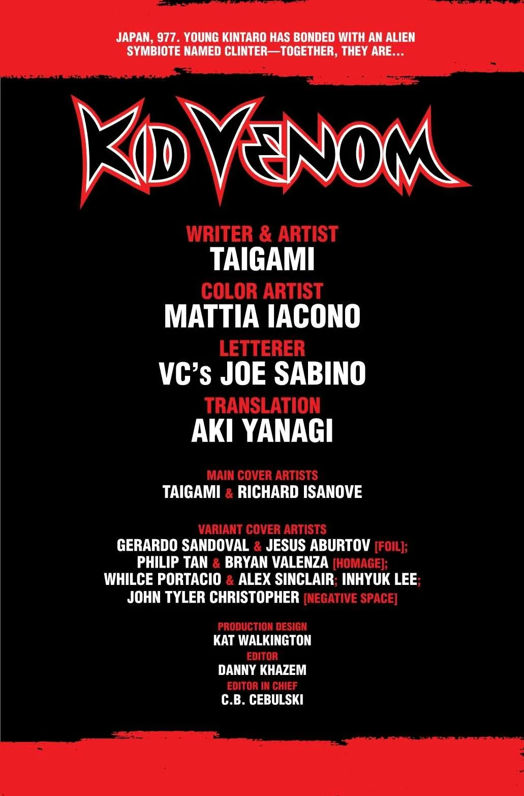 EMBRACE YOUR INNER VENOM! JAPAN, 977. KID VENOM has made his presence known to the evil symbiotes taking people and creatures hostage...but who else has their eye on Kintaro and his symbiote? The world of KID VENOM expands as new characters and dangers are revealed! Breakout manga creator TAIGAMI continues his vision of KID VENOM in this brand-new series!