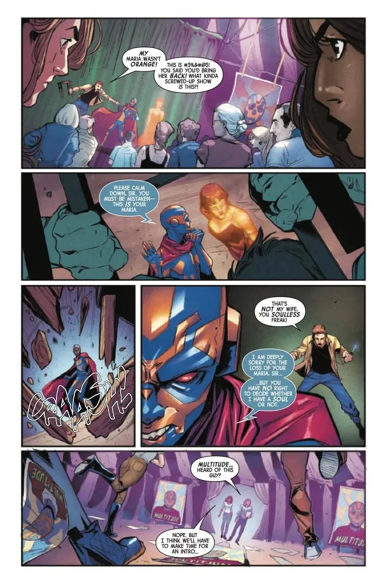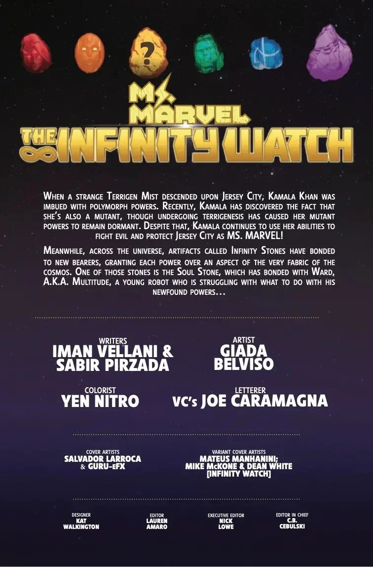 Hero or Villain? That's the question Multitude must answer as he stands at the crossroads of his own destiny, bonded to one of the Infinity Stones and brimming with power but no purpose. Will a run-in with Ms. Marvel be enough to tip the scales toward good, or will Multitude's guilt drag him down? Don't miss out as the Marvel Universe-shaking saga continues here, True Believers! PLUS, Derek Landy and Sara Pichelli bring NICK FURY into the story. But what ties him to the INFINITY WATCH?!"