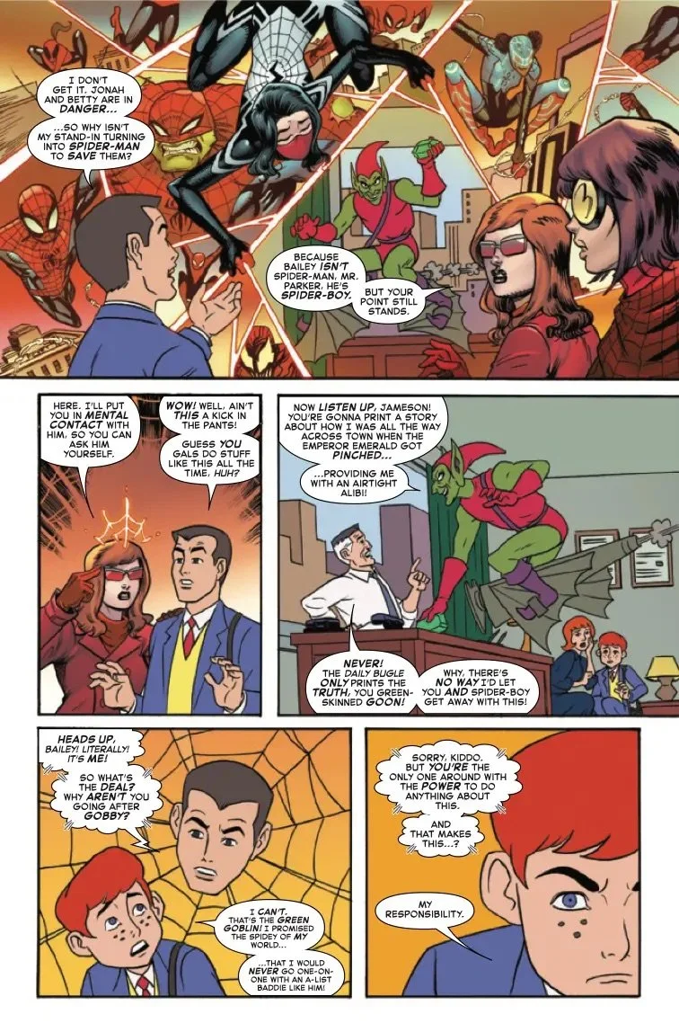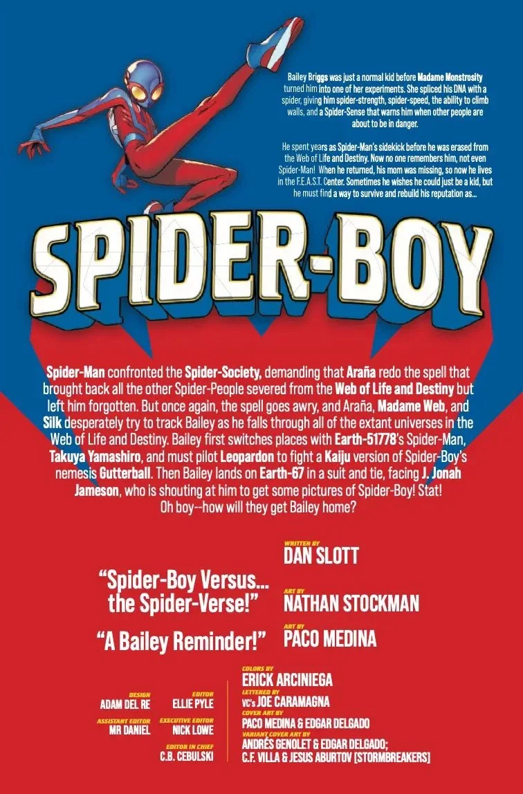 SPIDER-BOY meets the SPIDER-WARRIORS! Be careful, because each and every one of them is powered by spider-blood. Spider-blood? Yes, radioactive spider-blood! Guest-starring the SPIDER-SOCIETY. And featuring an event that will forever change how Spider-Man and Spider-Boy relate to each other - a major status quo change that will have massive repercussions for the two of them.