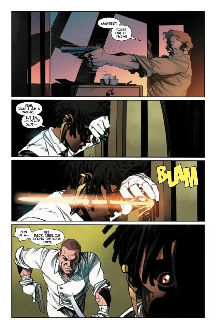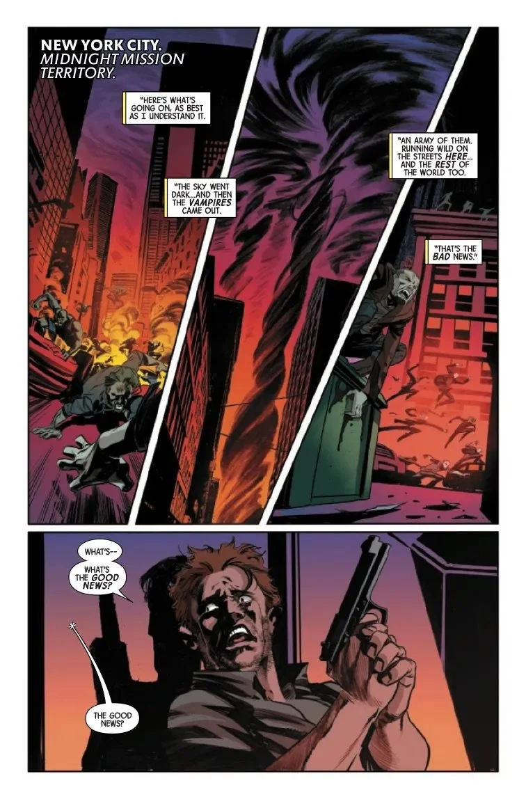As the Marvel Universe devolves in panic and fear with the unfolding BLOOD HUNT, writer JED MACKAY casts his gaze from the events of the main event to this companion tie-in! With more chaos on their hands than ever before, and no tested leader to show them the way, the MIDNIGHT MISSION is on their own as they fight like hell to save New York and its people from being completely overrun by vampires!