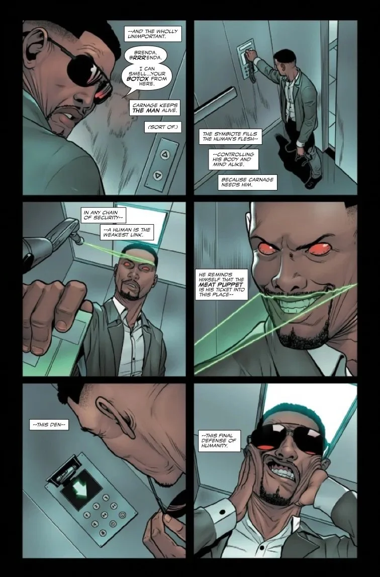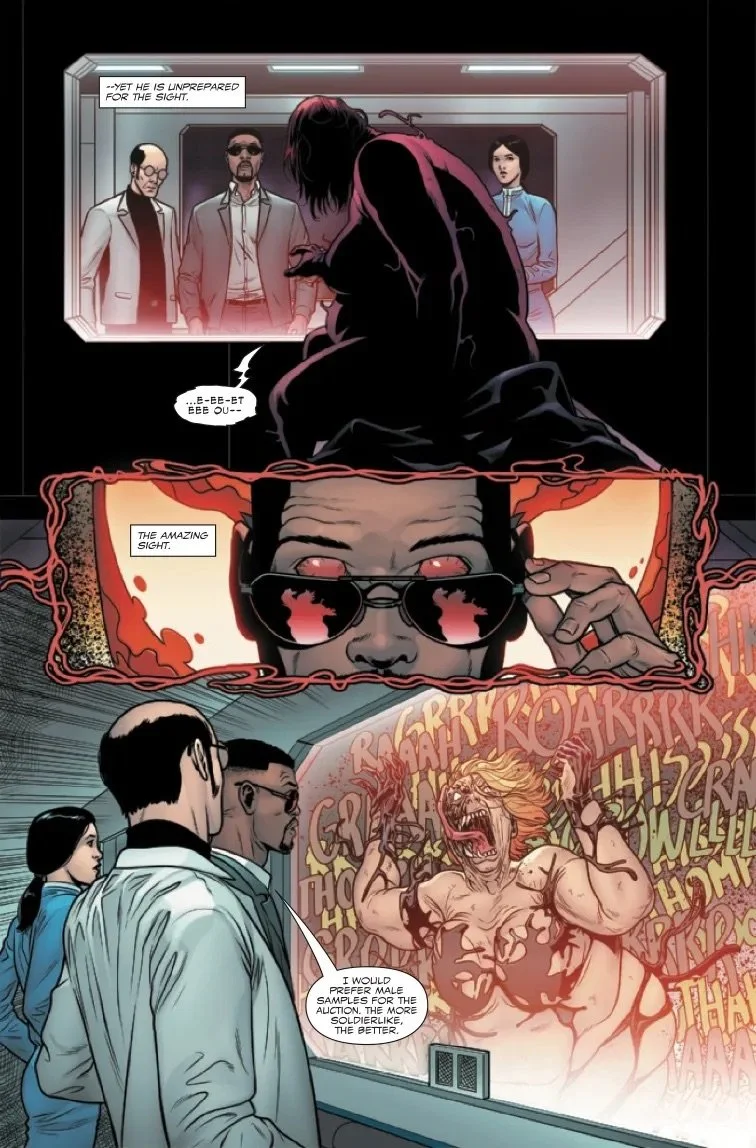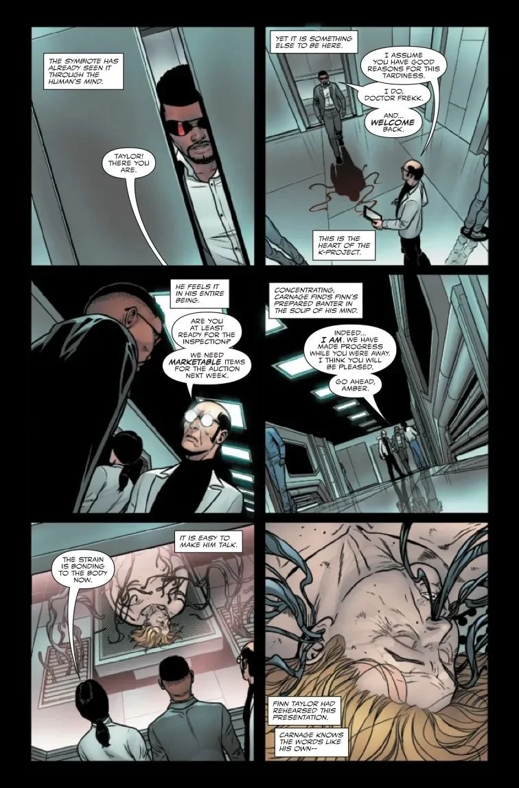 Carnage takes on a new host and breaks into the K-project to discover the horrible applications of the symbiote-killing K-chemical. But when everything goes sideways, he's saved by an unlikely ally - Meridius.