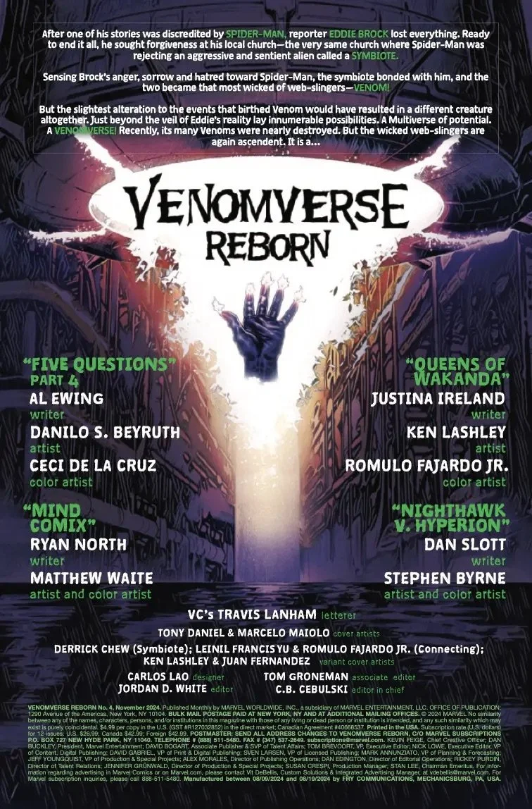 The journey across the VENOMVERSE reaches uncharted territory in the wide, weird and uncanny Marvel Universe(s)! Spider-scribe DAN SLOTT teams up with STEPHEN BYRNE to team NIGHTHAWK up with Venom! JUSTINA IRELAND and KEN LASHLEY travel to the ancient past and never-before-seen present of a Wakanda forged not of vibranium - but of symbiote! And AL EWING and DANILO S. BEYRUTH set the stage for what's to come for the future of the VENOMVERSE!