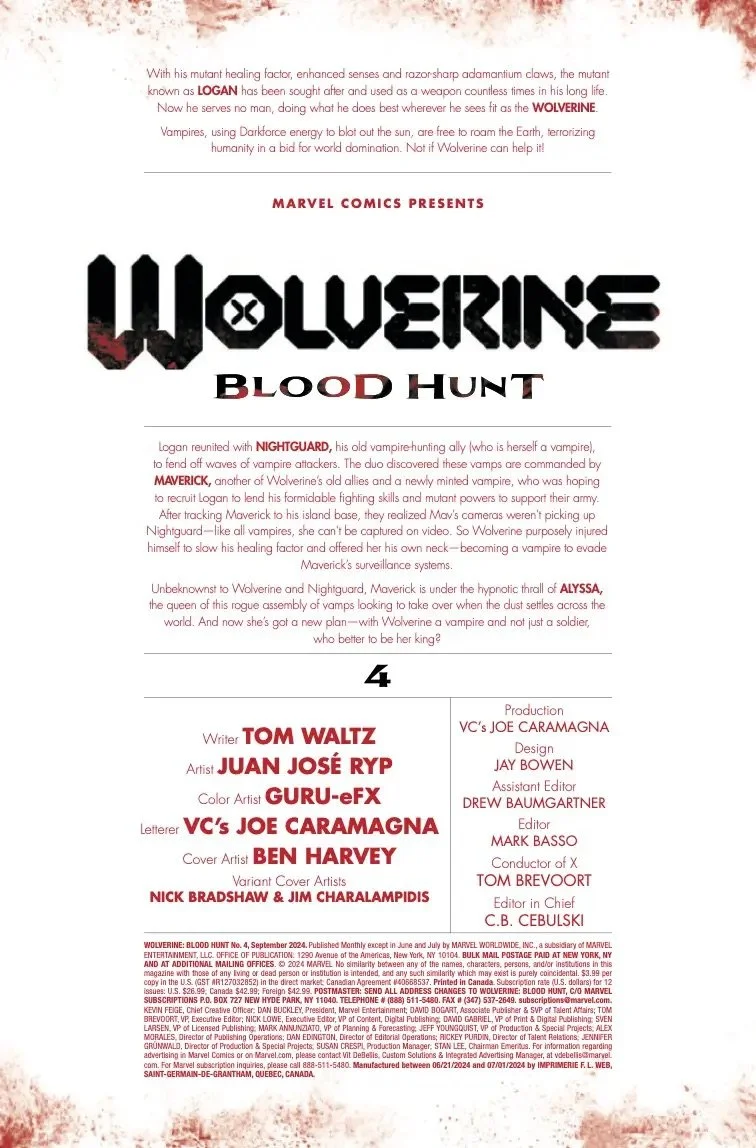 BETRAYAL lands WOLVERINE in a precarious spot - under the vampiric thrall of his enemies! With his healing factor stunted and the apex of the renegade vampire scheme at hand, ALYSSA takes her place as QUEEN OF THE VAMPIRES - with LOGAN as her king! The shocking finale to WOLVERINE: BLOOD HUNT...might just be the BEGINNING!